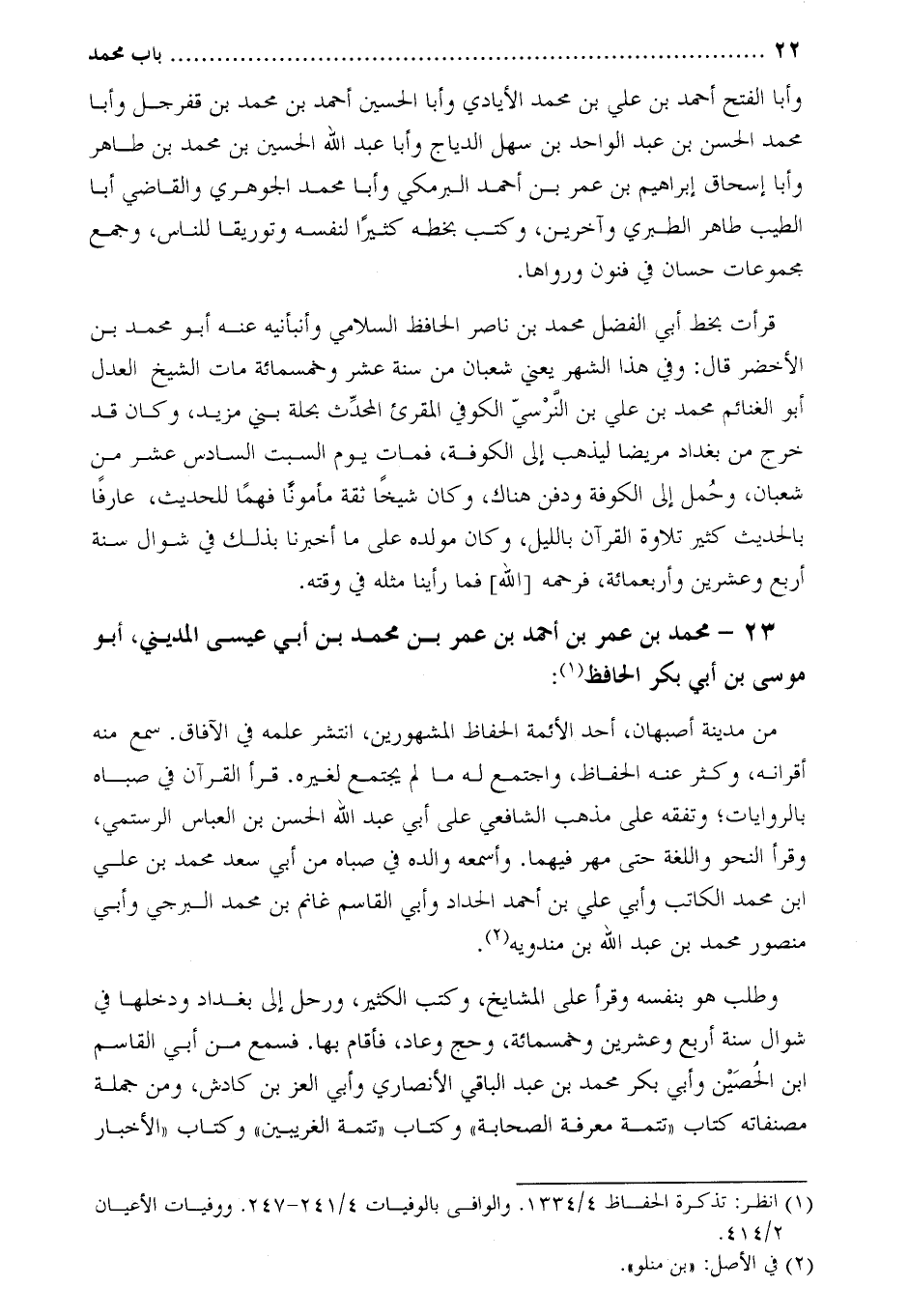 23- مُحَمَّد بْن عُمَرُ بْنُ أَحْمَدَ بْنِ عُمَرَ بْنِ مُحَمَّدِ بْن أَبِي عِيسَى المديني، أَبُو موسى بن أبي بكر الحافظ [1] :