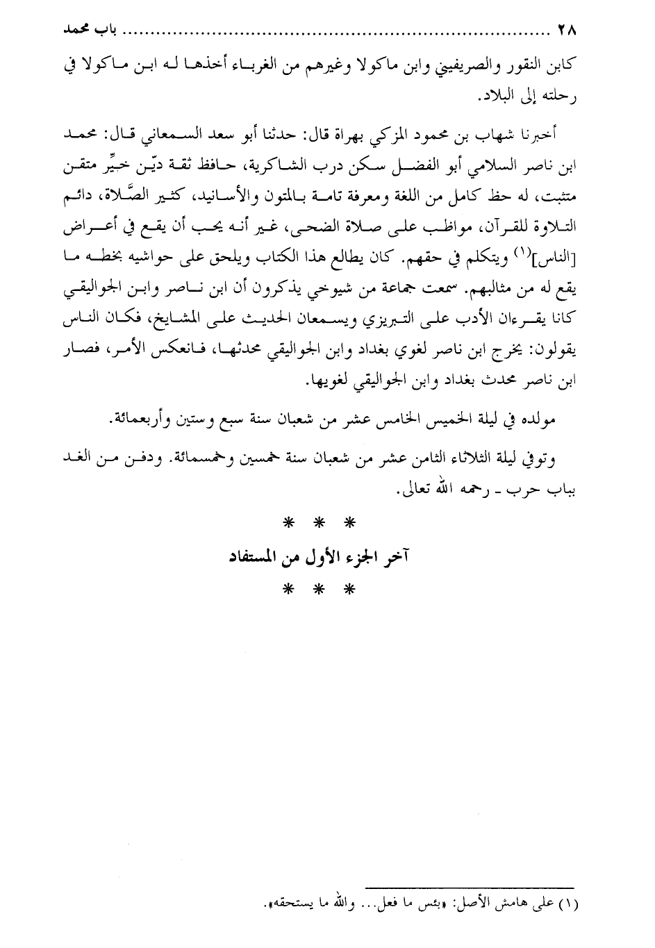 أخبرنا شهاب بن محمود المزكي بهراة قال: حدثنا أبو سعد السمعاني قال: محمد ابن ناصر السلامي أبو الفضل سكن درب الشاكرية، حافظ ثقة ديّن خيّر متقن متثبت، له حظ كامل من اللغة ومعرفة تامة بالمتون والأسانيد، كثير الصّلاة، دائم التلاوة للقرآن، مواظب على صلاة الضحى، غير أنه يحب أن يقع في أعراض [الناس] [1] ويتكلم في حقهم. كان يطالع هذا الكتاب ويلحق على حواشيه بخطه ما يقع له من مثالبهم. سمعت جماعة من شيوخي يذكرون أن ابن ناصر وابن الجواليقي كانا يقرءان الأدب على التبريزي ويسمعان الحديث على المشايخ، فكان الناس يقولون: يخرج ابن ناصر لغوي بغداد وابن الجواليقي محدثها، فانعكس الأمر، فصار ابن ناصر محدث بغداد وابن الجواليقي لغويها.