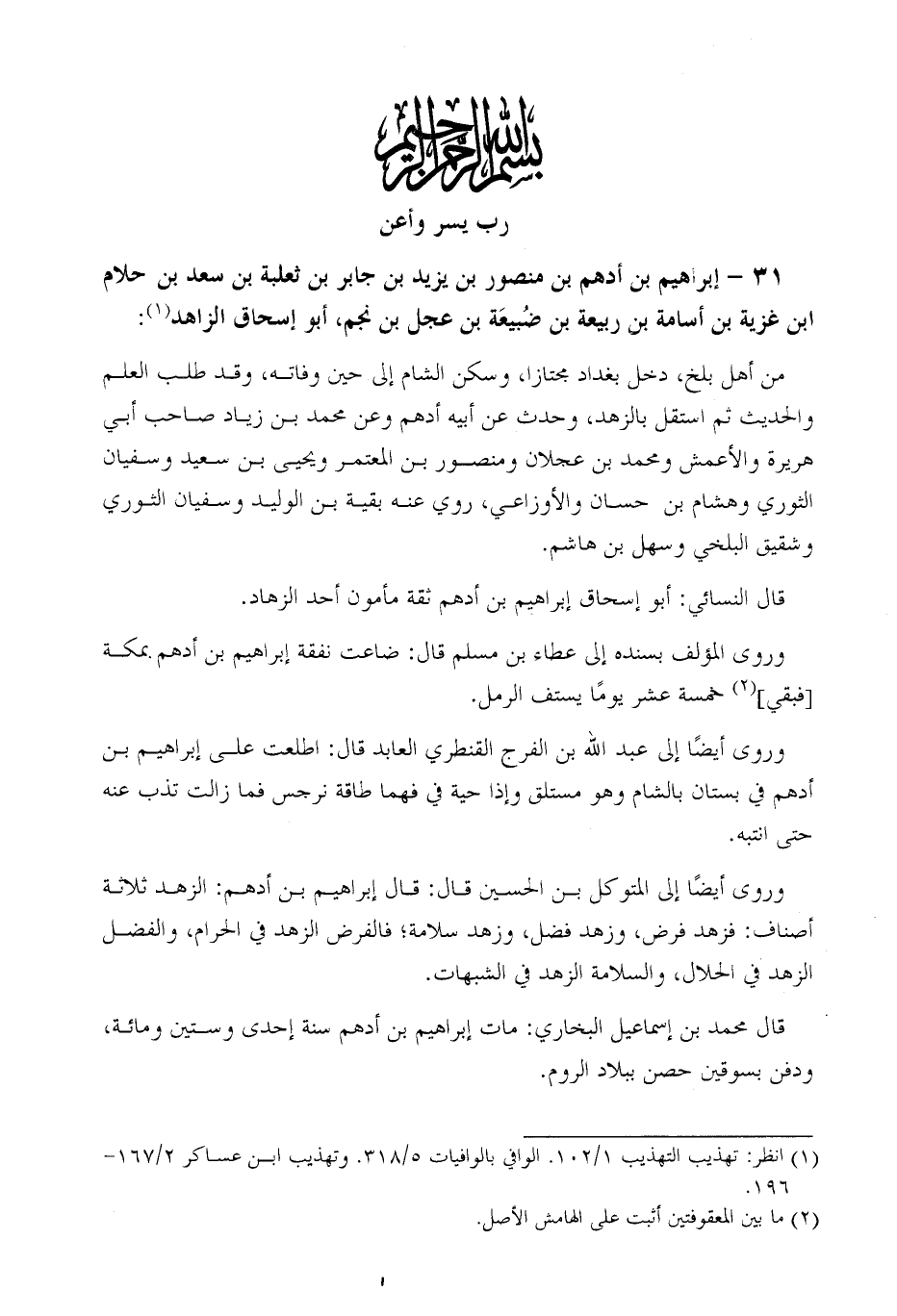 31- إبراهيم بن أدهم بن منصور بن يزيد بن جابر بن ثعلبة بن سعد بن حلام ابن غزية بن أسامة بن ربيعة بن ضبيعة بن عجل بن نجم، أبو إسحاق الزاهد [1] :