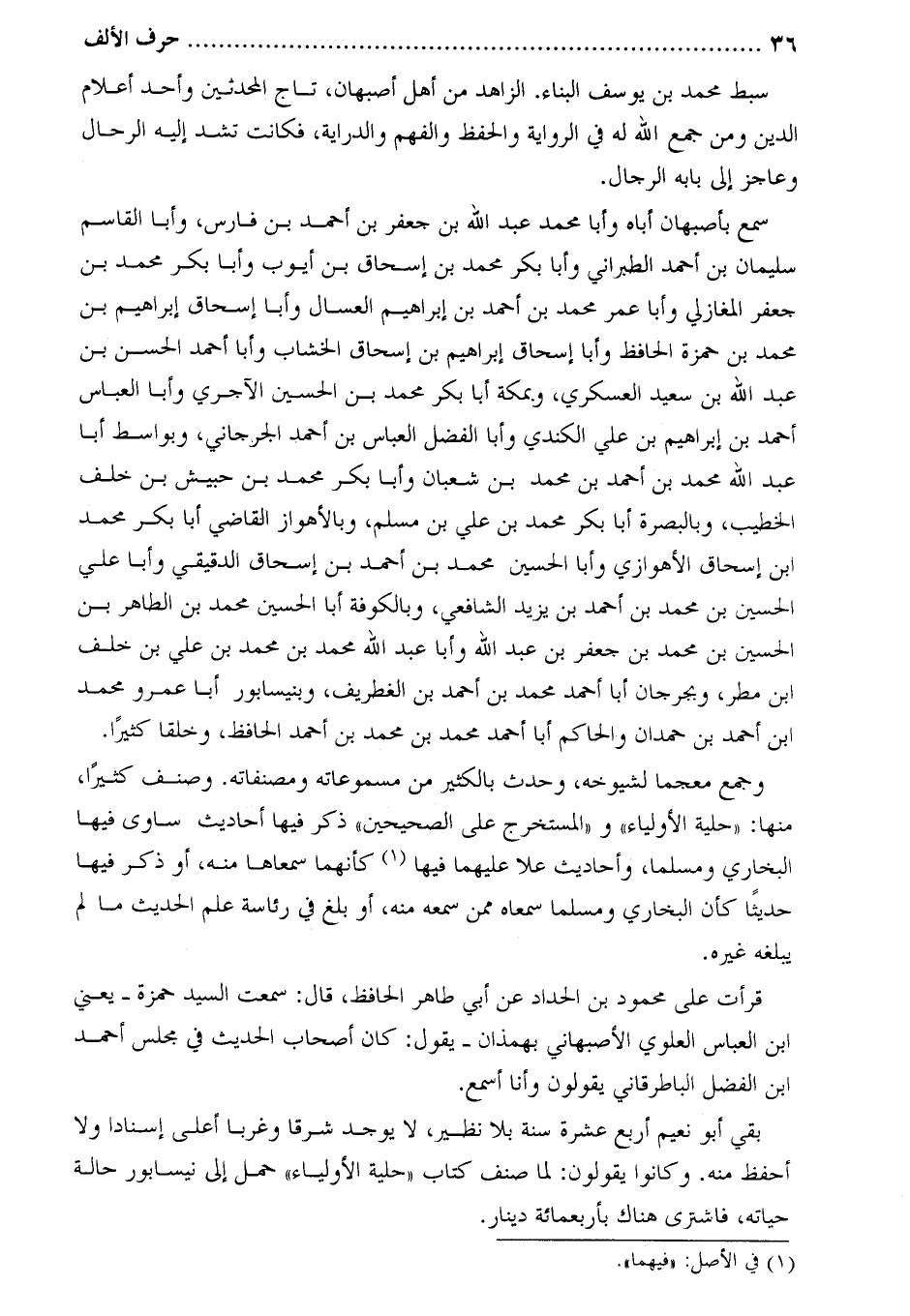 بقي أبو نعيم أربع عشرة سنة بلا نظير، لا يوجد شرقا وغربا أعلى إسنادا ولا أحفظ منه. وكانوا يقولون: لما صنف كتاب «حلية الأولياء» حمل إلى نيسابور حالة حياته، فاشترى هناك بأربعمائة دينار.
