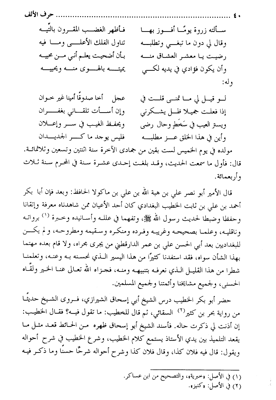قال الأمير أبو نصر عليّ بْن هبة اللَّه بْن عليّ بْن ماكولا الحافظ: وبعد فإن أبا بكر أحمد بن علي بن ثابت الخطيب البغدادي كان أحد الأعيان ممن شاهدناه معرفة وإتقانا وحفظا وضبطا لحديث رَسُولِ اللَّه صَلَّى اللَّهُ عَلَيْهِ وَسَلَّمَ، وتفهما في علله وأسانيده وخبرة [1] برواته وناقليه، وعلما بصحيحه وغريبه وفرده ومنكره وسقيمه ومطروحة، ولم يكن للبغداديين بعد أبي الحسن علي بن عمر الدارقطني من يجرى مجراه، ولا قام بعده مهتما بهذا الشأن سواه، فقد استفدنا كثيرا من هذا اليسير الذي نحسنه به وعنه، وتعلمنا شطرا من هذا القليل الذي نعرفه بتنبيهه ومنه، فجزاه الله تعالى عنا الخير ولقّاه الحسنى، ولجميع مشايخنا وأئمتنا ولجميع المسلمين.