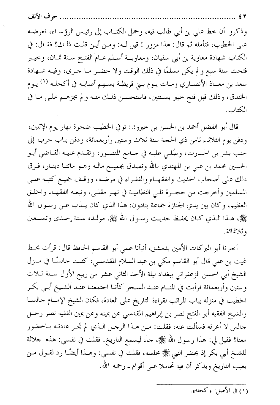 وذكروا أن خط علي بن أبي طالب فيه، وحمل الكتاب إلى رئيس الرؤساء، فعرضه على الخطيب، فتأمله ثم قال: هذا مزور! قيل له: ومن أين قلت ذلك؟ فقال: في الكتاب شهادة معاوية بن أبي سفيان، ومعاوية أسلم عام الفتح سنة ثمان، وخيبر فتحت سنة سبع ولم يكن مسلما في ذلك الوقت ولا حضر ما جرى، وفيه شهادة سعد بن معاذ الأنصاري ومات يوم بني قريظة بسهم أصابه في أكحله [1] يوم الخندق، وذلك قبل فتح خيبر بسنتين، فاستحسن ذلك منه ولم يجزهم على ما في الكتاب.