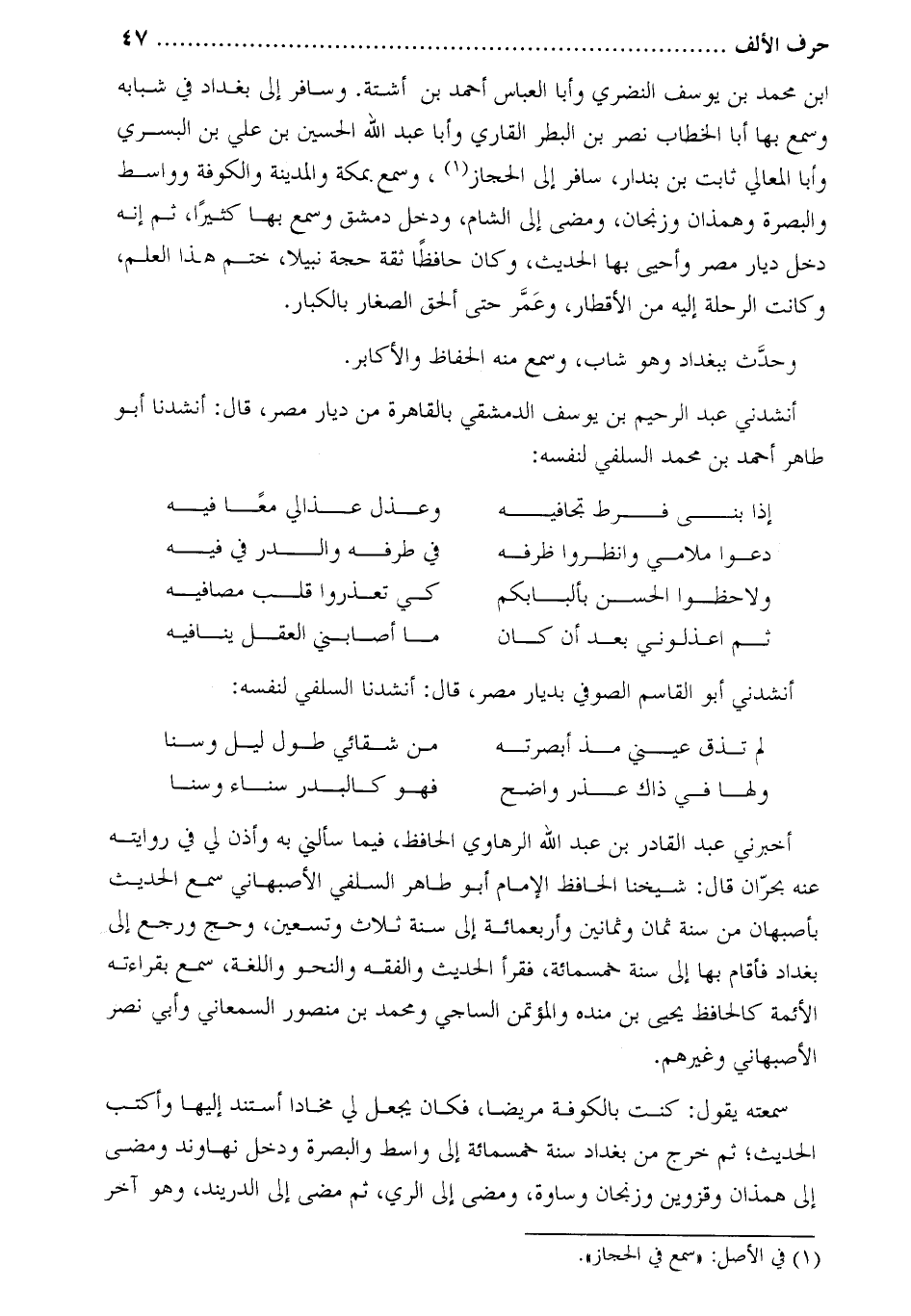 ابن محمد بن يوسف النضري وأبا العباس أحمد بن أشتة. وسافر إلى بغداد في شبابه وسمع بها أبا الخطاب نصر بن البطر القاري وأبا عبد الله الحسين بن علي بن البسري وأبا المعالي ثابت بن بندار، سافر إلى الحجاز [1] ، وسمع بمكة والمدينة والكوفة وواسط والبصرة وهمذان وزنجان، ومضى إلى الشام، ودخل دمشق وسمع بها كثيرا، ثم إنه دخل ديار مصر وأحيا بها الحديث، وكان حافظا ثقة حجة نبيلا، ختم هذا العلم، وكانت الرحلة إليه من الأقطار، وعمّر حتى ألحق الصغار بالكبار.