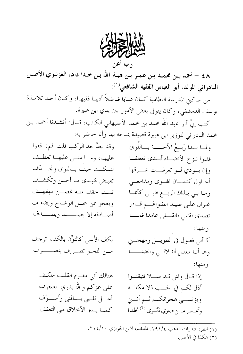 كتب إِلَى أَبُو عَبْد اللَّه مُحَمَّد بْن محمد الأصبهاني الكاتب، قال: أنشدنا أحمد بن محمد البادرائي للوزير ابن هبيرة قصيدة يمدحه بها وأنا حاضر به: