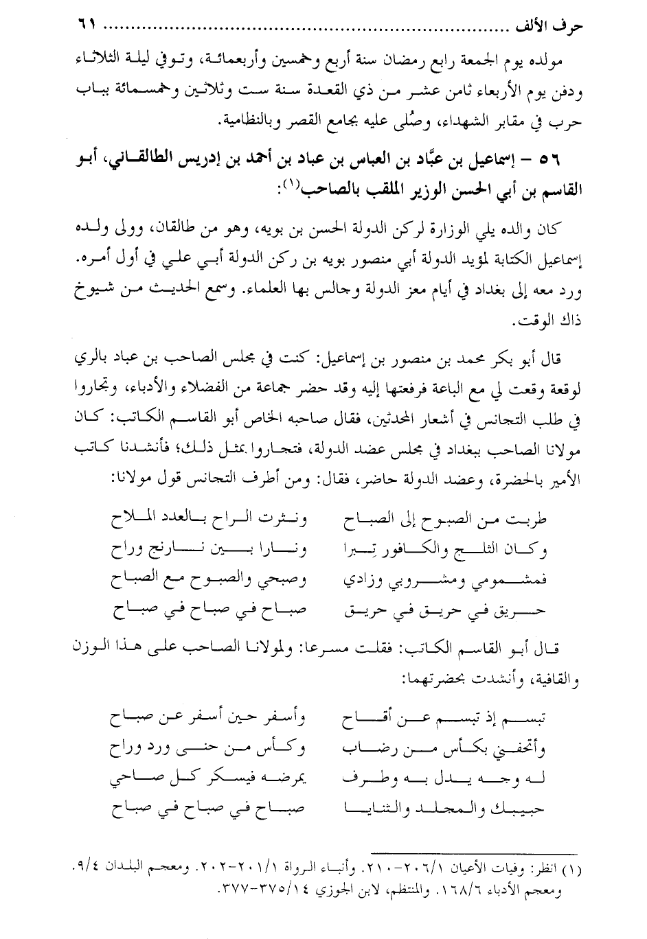56- إسماعيل بن عبّاد بن العباس بن عباد بن أحمد بن إدريس الطالقاني، أبو القاسم بن أبي الحسن الوزير الملقب بالصاحب [1] :