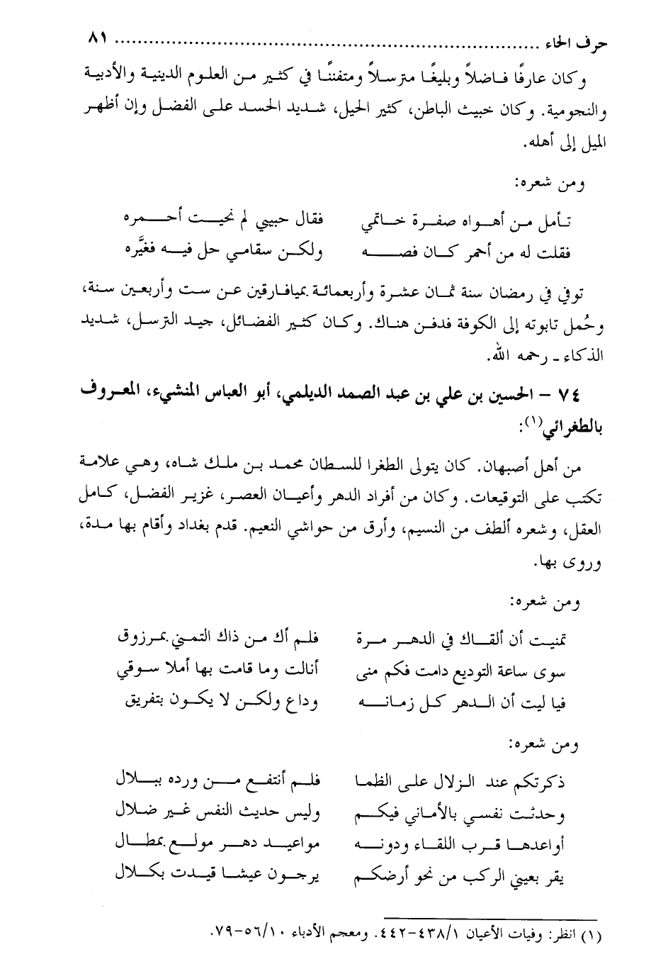 74- الحسين بن علي بن عبد الصمد الديلمي، أبو العباس المنشئ، المعروف بالطغرائي [1] :