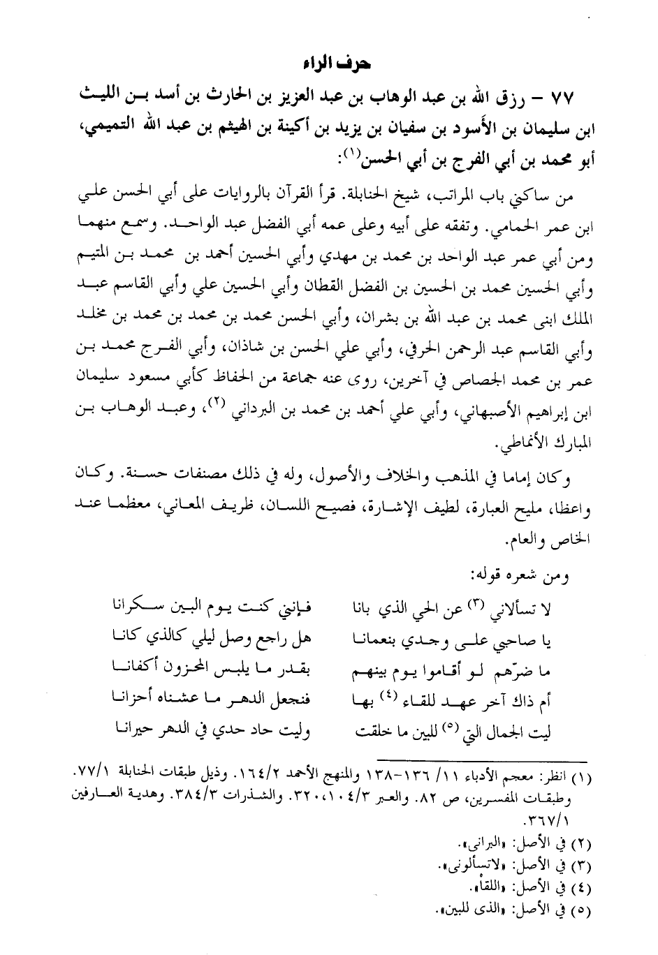 77- رزق الله بن عَبْد الوهاب بْن عَبْد العزيز بْن الحارث بن أسد بن الليث ابن سليمان بن الأسود بن سفيان بن يزيد بن أكينة بن الهيثم بن عبد الله التميمي، أبو محمد بن أبي الفرج بن أبي الحسن [1] :