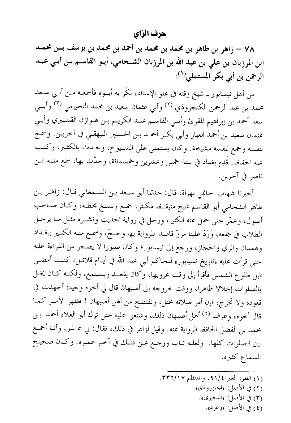 أخبرنا شهاب الحاتمي بهراة، قال: حدثنا أبو سعد بن السمعاني قال: زاهر بن طاهر الشحامي أبو القاسم شيخ متيقظ مكثر، جمع ونسخ بخطه، وكان صاحب أصول، وعمّر حتى حمل عنه الكثير، ورحل في رواية الحديث ونشره مثل ما يرحل الطلاب في جمعه، ورد علينا مرو قاصدا للرواية بها وحجّ، وسمع منه الكثير ببغداد وهمذان والري والحجاز، ورجع إلى نيسابور؛ وكان صبورا لا يضجر من القراءة عليه حتى قرأت عليه «تاريخ نيسابور» للحاكم أبي عبد الله في أيام قلائل، كنت أمضي قبل طلوع الشمس فأقرأ إلى وقت غروبها، وكان يقعد ويستمع، ولكنه كان يخل بالصلوات إخلالا ظاهرا، ووقت خروجه إلى أصبهان قال لي أخوه وجيه: أجهدت في قعوده ولا تخرج، فإن أمر صلاته مختل، ونفتضح من أهل أصبهان! فظهر الأمر كما قال أخوه، وعرف [4] أهل أصبهان ذلك، وشنعوا عليه حتى ترك أبو الْعَلاءِ أَحْمَدَ بْنَ مُحَمَّدِ بْنِ الْفَضْلِ الْحَافِظَ الرواية عنه. وقيل لزاهر في ذلك، فقال: لي عذر، وأنا أجمع بين الصلوات كلها. ولعله تاب ورجع عن ذلك في آخر عمره. وكان صحيح السماع كثيره.
