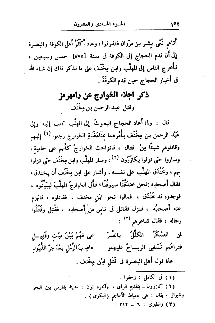 قال: ولما أعاد الحجاج البعوث إلى المهلّب كتب إليه وإلى عبد الرحمن بن مخنف يأمرهما بمناهضة الخوارج رجعوا «1» إليهم وقاتلوهم شيئا من قتال، فانزاحت الخوارج كأنهم على حامية، وساروا حتى نزلوا بكازرون «2» ، وسار المهلّب وابن مخنف حتى نزلوا بهم، وخندق المهلّب على نفسه، وأشار على ابن مخنف أن يخندق، فقال أصحابه: نحن خندقنا سيوفنا، فأتى الخوارج المهلّب ليبيّتوه، فوجدوه قد خندق، فمالوا نحو ابن مخنف، فقاتلوه، فانهزم عنه أصحابه، فنزل فقاتل فى ناس من أصحابه، فقتل وقتلوا رجاله، فقال شاعرهم «3» :