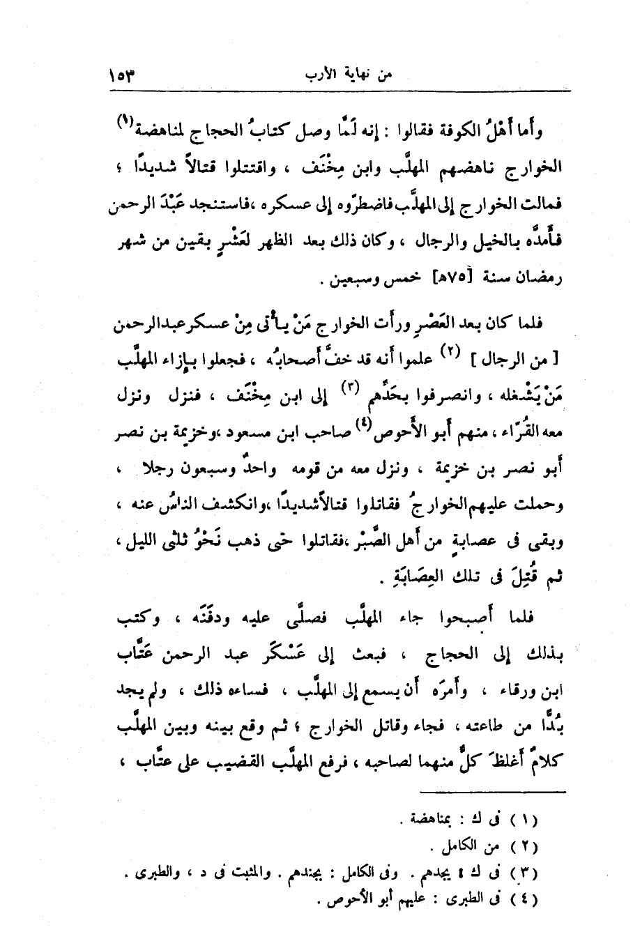 وأما أهل الكوفة فقالوا: إنه لمّا وصل كتاب الحجاج لمناهضة «1» الخوارج ناهضهم المهلّب وابن مخنف، واقتتلوا قتالا شديدا؛ فمالت الخوارج إلى المهلّب فاضطرّوه إلى عسكره، فاستنجد عبد الرحمن فأمدّه بالخيل والرجال، وكان ذلك بعد الظهر لعشر بقين من شهر رمضان سنة [75 هـ] خمس وسبعين.