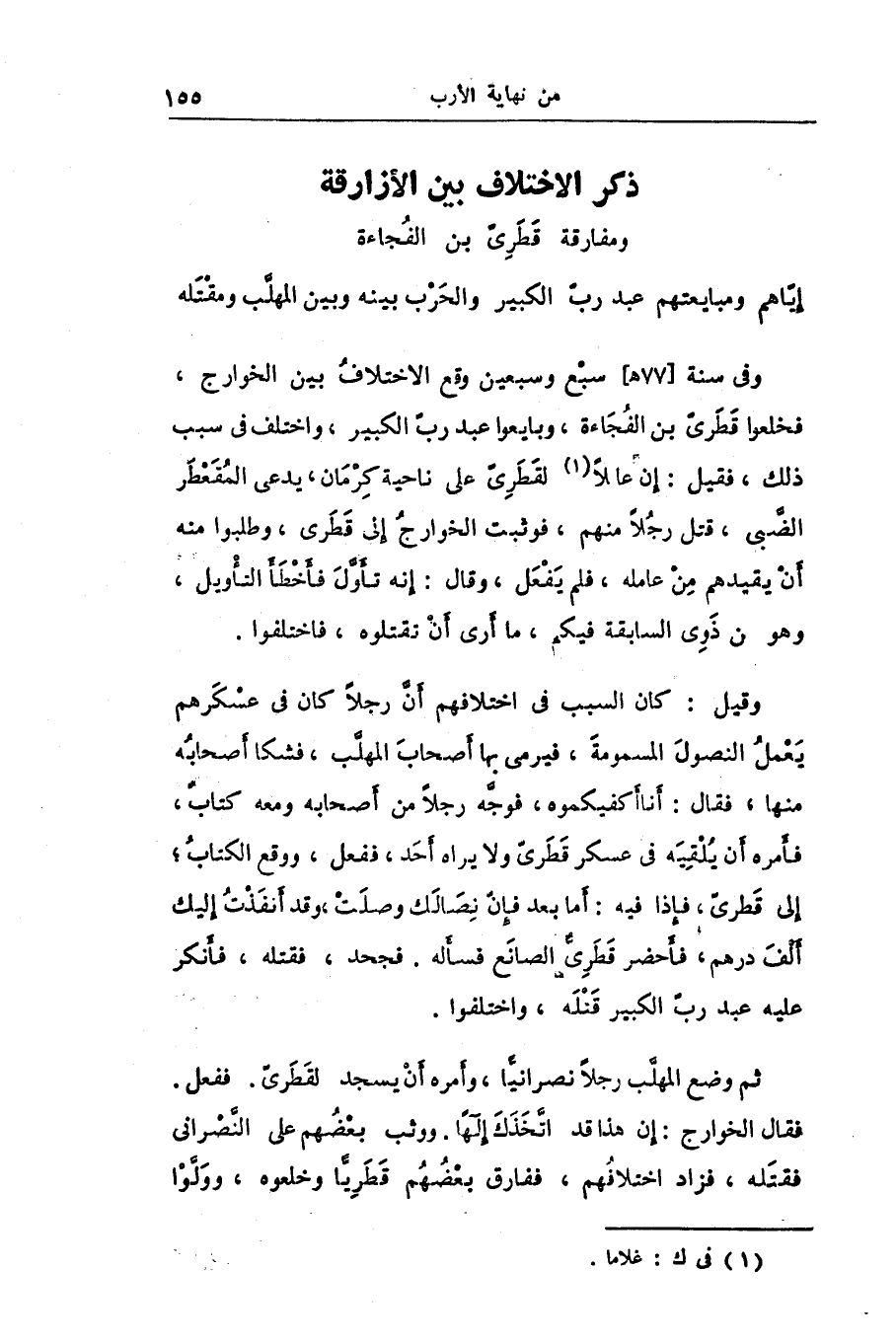 إيّاهم ومبايعتهم عبد ربّ الكبير والحرب بينه وبين المهلّب ومقتله وفى سنة [77 هـ] سبع وسبعين وقع الاختلاف بين الخوارج، فخلعوا قطرىّ بن الفجاءة، وبايعوا عبد ربّ الكبير، واختلف فى سبب ذلك، فقيل: إن عائلا «1» لقطرىّ على ناحية كرمان، يدعى المقعطر الضّبى، قتل رجلا منهم، فوثبت الخوارج إلى قطرى، وطلبوا منه أن يقيدهم من عامله، فلم يفعل، وقال: إنه تأوّل فأخطأ التأويل، وهو من ذوى السابقة فيكم، ما أرى أن تقتلوه، فاختلفوا.