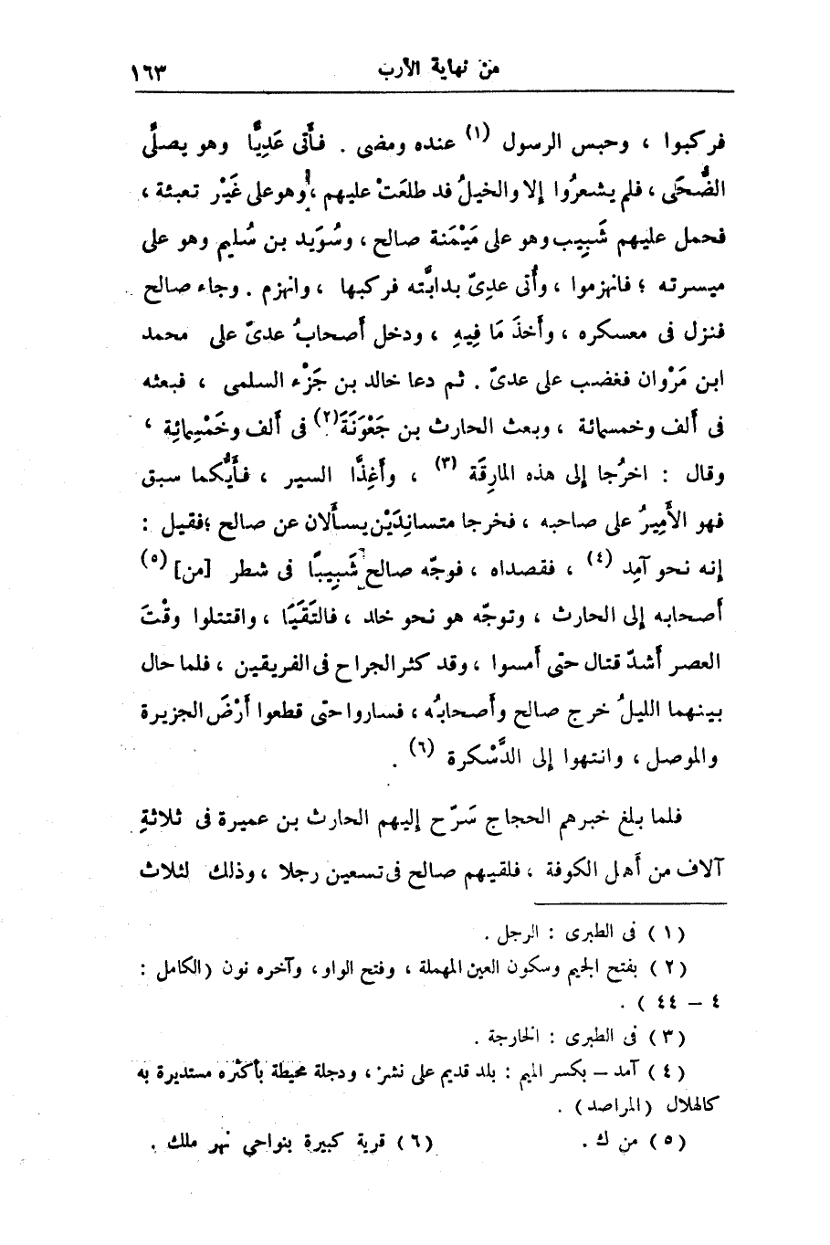 فركبوا، وحبس الرسول «1» عنده ومضى. فأتى عديّا وهو يصلّى الضّحى، فلم يشعروا إلا والخيل فد طلعت عليهم، وهو على غير تعبئة، فحمل عليهم شبيب وهو على ميمنة صالح، وسويد بن سليم وهو على ميسرته؛ فانهزموا، وأتى عدىّ بدابّته فركبها، وانهزم. وجاء صالح فنزل فى معسكره، وأخذ ما فيه، ودخل أصحاب عدىّ على محمد ابن مروان فغضب على عدىّ. ثم دعا خالد بن جزء السلمى، فبعثه فى ألف وخمسمائة، وبعث الحارث بن جعونة «2» فى ألف وخمسمائة، وقال: اخرجا إلى هذه المارقة «3» ، وأغذّا السير، فأيّكما سبق فهو الأمير على صاحبه، فخرجا متساندين يسألان عن صالح؛ فقيل: