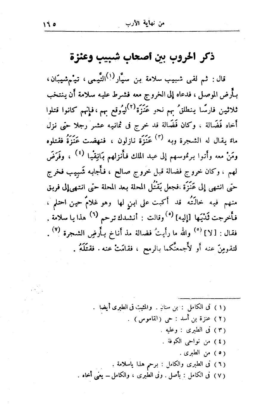 قال: ثم لقى شبيب سلامة بن سيّار «1» التّيمى، تيم شيبان، بأرض الموصل، فدعاه إلى الخروج معه فشرط عليه سلامة أن ينتخب ثلاثين فارسا ينطلق بهم نحو عنزة «2» ليوقع بهم، فإنهم كانوا قتلوا أخاه فضالة، وكان فضالة قد خرج فى ثمانيه عشر رجلا حتى نزل ماء يقال له الشجرة وبه «3» عنزة نازلون، فنهضت عنزة فقتلوه ومن معه وأتوا برءوسهم إلى عبد الملك فأنزلهم بانقيا «4» ، وفرض لهم، وكان خروج فضالة قبل خروج صالح، فأجابه شبيب فخرج حتى انتهى إلى عنزة، فجعل يقتل المحلة بعد المحلة حتى انتهى إلى فريق منهم فيه خالته قد أكبت على ابن لها وهو غلام حين احتلم، فأخرجت ثديها [إليه] «5» وقالت: أنشدك ترحم «6» هذا يا سلامة.