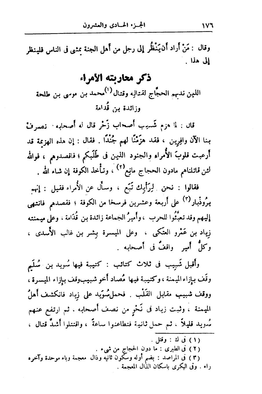قال: لما هزم شيب أصحاب زحر قال له أصحابه نصرف بنا الآن وافرين، فقد هزمنا لهم جندا. فقال: إن هذه الهزيمة قد أرعبت قلوب الأمراء والجنود الذين فى طلبكم؛ فاقصدوهم، فو الله لئن قاتلناهم مادون الحجاج مانع «2» ، ونأخذ الكوفة إن شاء الله.