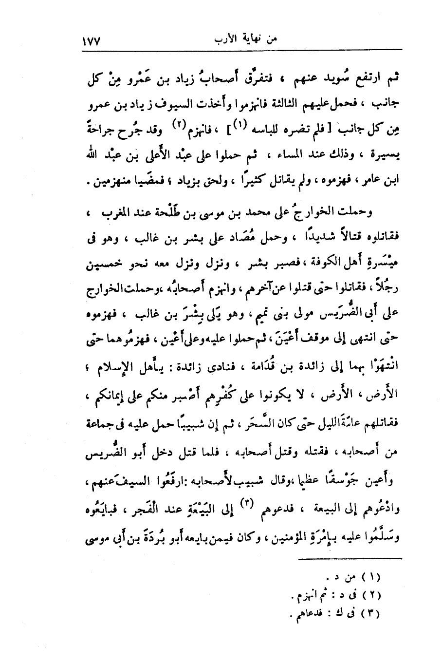 وحملت الخوارج على محمد بن موسى بن طلحة عند المغرب، فقاتلوه قتالا شديدا، وحمل مصاد على بشر بن غالب، وهو فى ميسرة أهل الكوفة، فصبر بشر، ونزل ونزل معه نحو خمسين رجلا، فقاتلوا حتى قتلوا عن آخرهم، وانهزم أصحابه، وحملت الخوارج على أبى الضّريس مولى بنى تميم، وهو يلى بشر بن غالب، فهزموه حتى انتهى إلى موقف أعين، ثم حملوا عليه وعلى أعين، فهزموهما حتى انتهوا بهما إلى زائدة بن قدامة، فنادى زائدة: يأهل الإسلام؛ الأرض، الأرض، لا يكونوا على كفرهم أصبر منكم على إيمانكم، فقاتلهم عامة الليل حتى كان السّحر، ثم إن شبيبا حمل عليه فى جماعة من أصحابه، فقتله وقتل أصحابه، فلما قتل دخل أبو الضّريس وأعين جوسقا عظيما، وقال شبيب لأصحابه: ارفعوا السيف عنهم، وادعوهم إلى البيعة، فدعوهم «3» إلى البيعة عند الفجر، فبايعوه وسلّموا عليه بإمرة المؤمنين، وكان فيمن بايعه أبو بردة بن أبى موسى