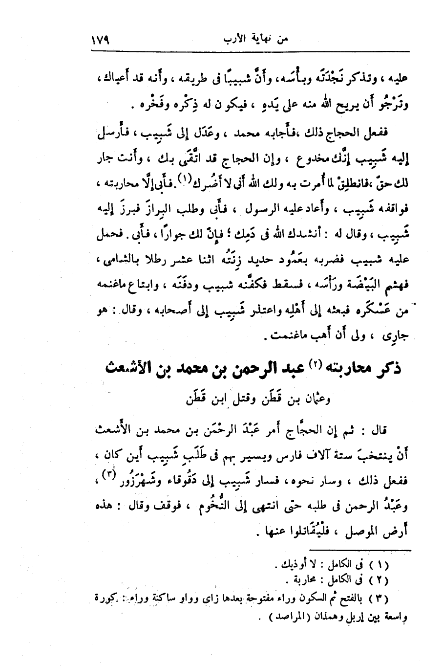 قال: ثم إن الحجّاج أمر عبد الرحمن بن محمد بن الأشعث أن ينتخب ستة آلاف فارس ويسير بهم فى طلب شبيب أين كان، ففعل ذلك، وسار نحوه، فسار شبيب إلى دقوقاء وشهرزور «3» ، وعبد الرحمن فى طلبه حتى انتهى إلى التّخوم، فوقف وقال: هذه أرض الموصل، فليقاتلوا عنها.