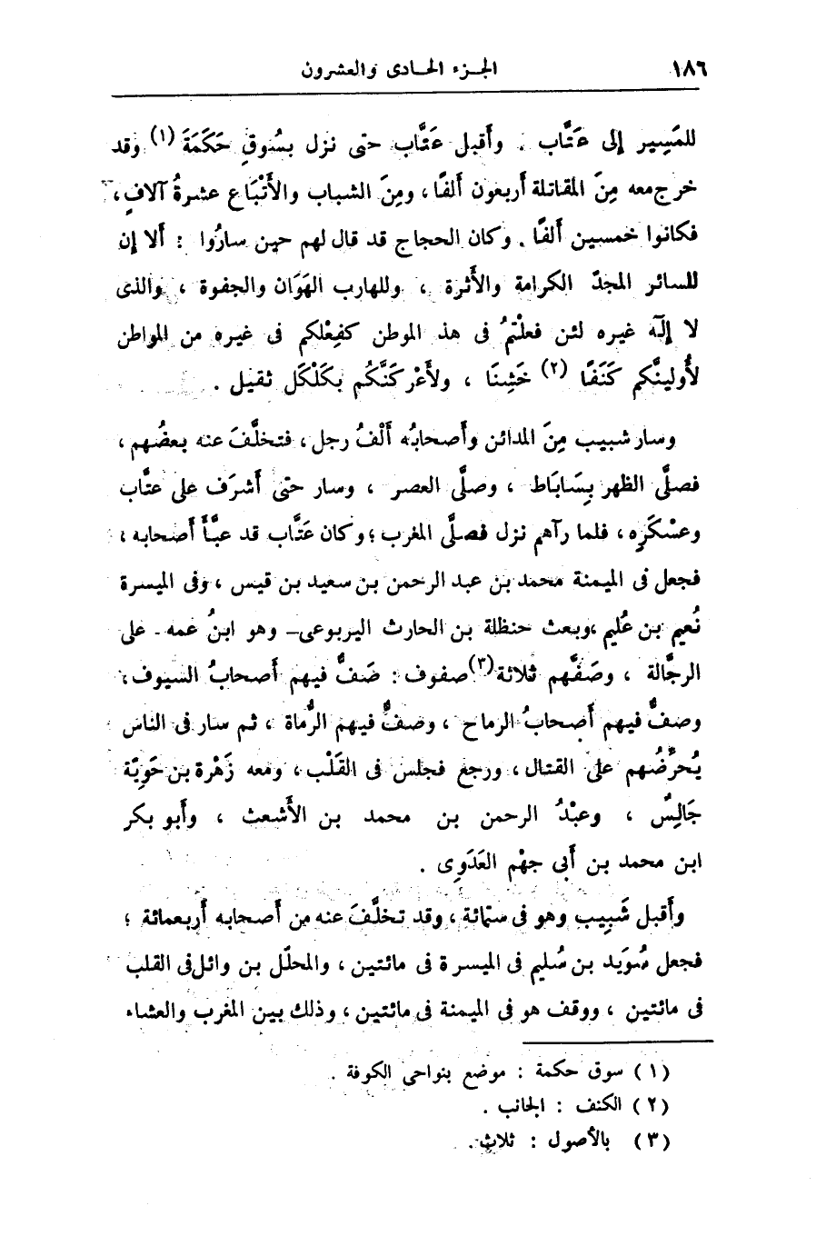 وسار شبيب من المدائن وأصحابه ألف رجل، فتخلّف عنه بعضهم، فصلّى الظهر بساباط، وصلّى العصر، وسار حتى أشرف على عتّاب وعسكره، فلما رآهم نزل فصلّى المغرب؛ وكان عتّاب قد عبّأ أصحابه، فجعل فى الميمنة محمد بن عبد الرحمن بن سعيد بن قيس، وفى الميسرة نعيم بن عليم، وبعث حنظلة بن الحارث اليربوعى- وهو ابن عمه على الرجّالة، وصفّهم ثلاثة «3» صفوف: صفّ فيهم أصحاب السيوف، وصفّ فيهم أصحاب الرماح، وصفّ فيهم الرّماة، ثم سار فى الناس يحرّضهم على القتال، ورجع فجلس فى القلب، ومعه زهرة بن حويّة جالس، وعبد الرحمن بن محمد بن الأشعث، وأبو بكر ابن محمد بن أبى جهم العدوى.