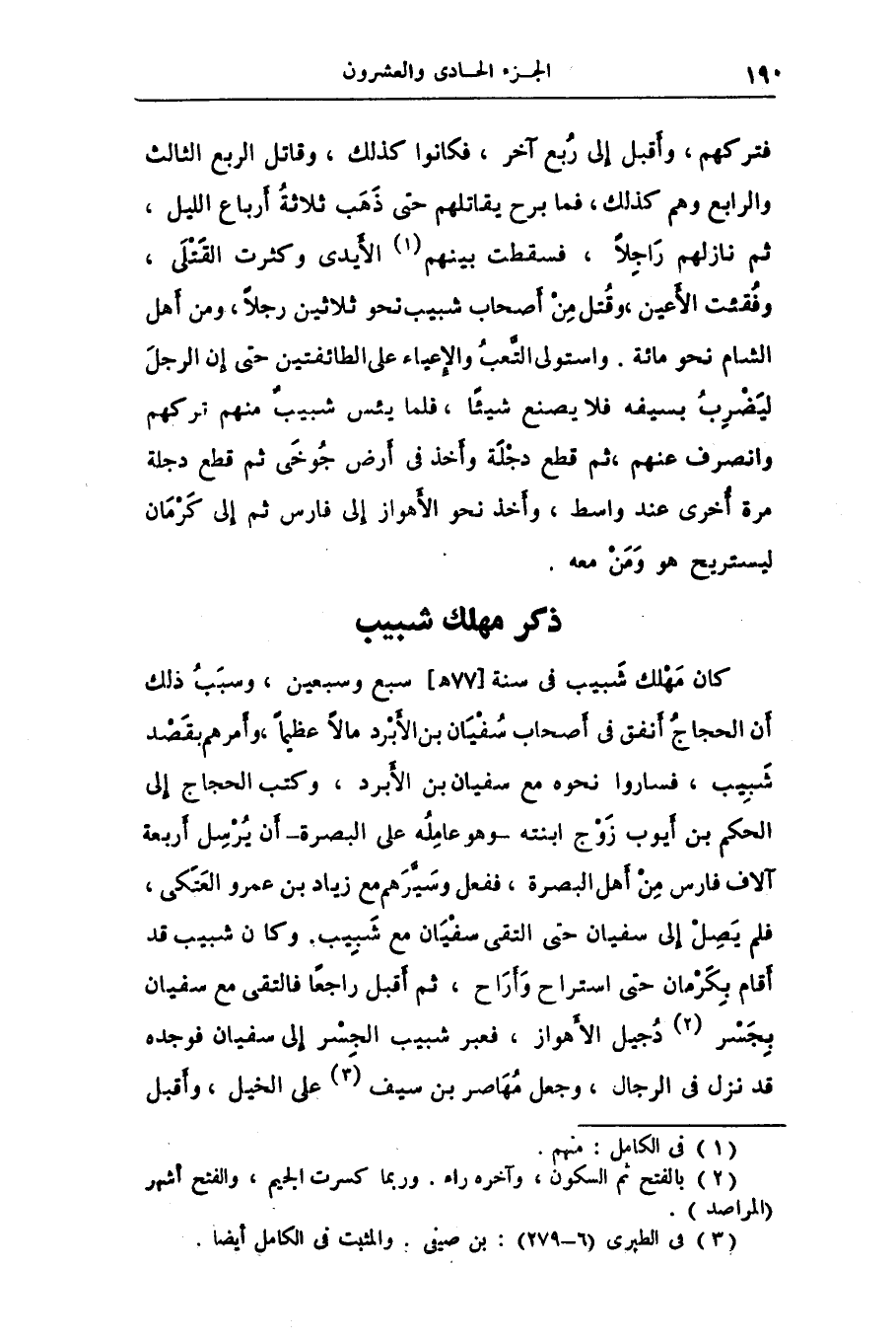 كان مهلك شبيب فى سنة [77 هـ] سبع وسبعين، وسبب ذلك أن الحجاج أنفق فى أصحاب سفيان بن الأبرد مالا عظيما، وأمرهم بقصد شبيب، فساروا نحوه مع سفيان بن الأبرد، وكتب الحجاج إلى الحكم بن أيوب زوج ابنته- وهو عامله على البصرة- أن يرسل أربعة آلاف فارس من أهل البصرة، ففعل وسيّرهم مع زياد بن عمرو العتكى، فلم يصل إلى سفيان حتى التقى سفيان مع شبيب. وكان شبيب قد أقام بكرمان حتى استراح وأراح، ثم أقبل راجعا فالتقى مع سفيان بجسر «2» دجيل الأهواز، فعبر شبيب الجسر إلى سفيان فوجده قد نزل فى الرجال، وجعل مهاصر بن سيف «3» على الخيل، وأقبل