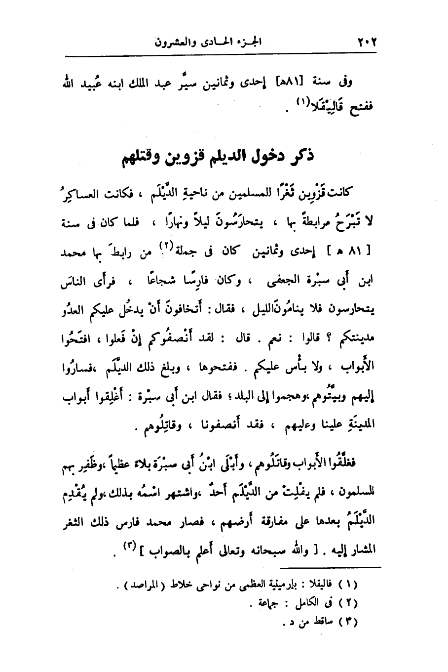 فغلّقوا الأبواب وقاتلوهم، وأبلى ابن أبى سبرة بلاء عظيما، وظفر بهم المسلمون، فلم يفلت من الدّيلم أحد، واشتهر اسمه بذلك، ولم يقدم الدّيلم بعدها على مفارقة أرضهم، فصار محمد فارس ذلك الثغر المشار إليه. [والله سبحانه وتعالى أعلم بالصواب] «3» .