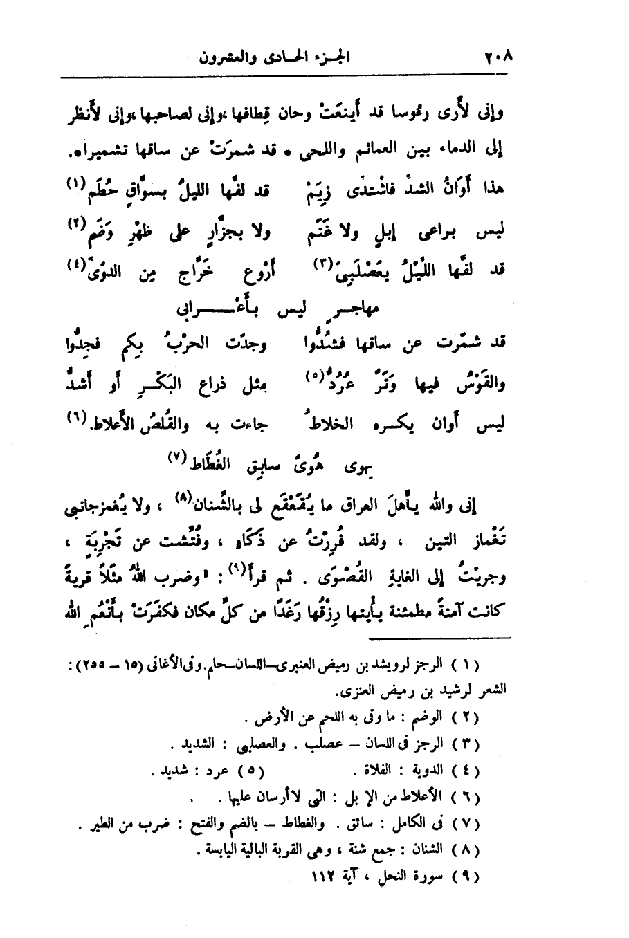 إنى والله يأهل العراق ما يقعقع لى بالشّنان «8» ، ولا يغمز جانبى تغماز التين، ولقد فررت عن ذكاء، وفتّشت عن تجربة، وجريت إلى الغاية القصوى. ثم قرأ «9» : «وَضَرَبَ اللَّهُ مَثَلًا قَرْيَةً كانَتْ آمِنَةً مُطْمَئِنَّةً يَأْتِيها رِزْقُها رَغَداً مِنْ كُلِّ مَكانٍ فَكَفَرَتْ بِأَنْعُمِ اللَّهِ