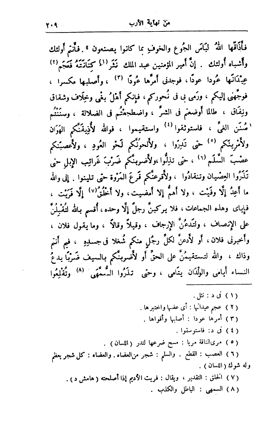 . فأنتم أولئك وأشباه أولئك. إنّ أمير المؤمنين عبد الملك نثر «1» كنانته فعجم «2» عيدانها عودا عودا، فوجدنى أمرّها عودا «3» ، وأصلبها مكسرا، فوجّهنى إليكم، ورمى بى فى نحوركم، فإنكم أهل بغى وخلاف وشقاق ونفاق، طالما أوضعتم فى الشرّ، واضطجعتم فى الضلالة، وسننتم سنن الغىّ، فاستوثقوا «4» واستقيموا، فو الله لأذيقنّكم الهوان ولأمرينّكم «5» حتى تدرّوا، ولألحونّكم لحو العود، ولأعصبنّكم عصب السّلم «6» ، حتى تذلّوا، ولأضربنّكم ضرب غرائب الإبل حتى تذروا العصيان وتنقادوا، ولأقرعنّكم قرع المروة حتى تلينوا. إنى والله ما أعد إلّا وفيت، ولا أهمّ إلا أمضيت، ولا أخلق «7» إلّا فريت، فإياى وهذه الجماعات، فلا يركبنّ رجل إلّا وحده، أقسم بالله لتقبلنّ على الإنصاف، ولتدعنّ الإرجاف، وقيلا وقالا، وما يقول فلان، وأخبرنى فلان، أو لأدعنّ لكلّ رجل منكم شغلا فى جسده، فيم أنتم وذاك، والله لتستقيمنّ على الحقّ أو لأضربنّكم بالسيف ضربا يدع النساء أيامى والولدان يتامى، وحتى تذروا السّمّهى «8» وتقلعوا