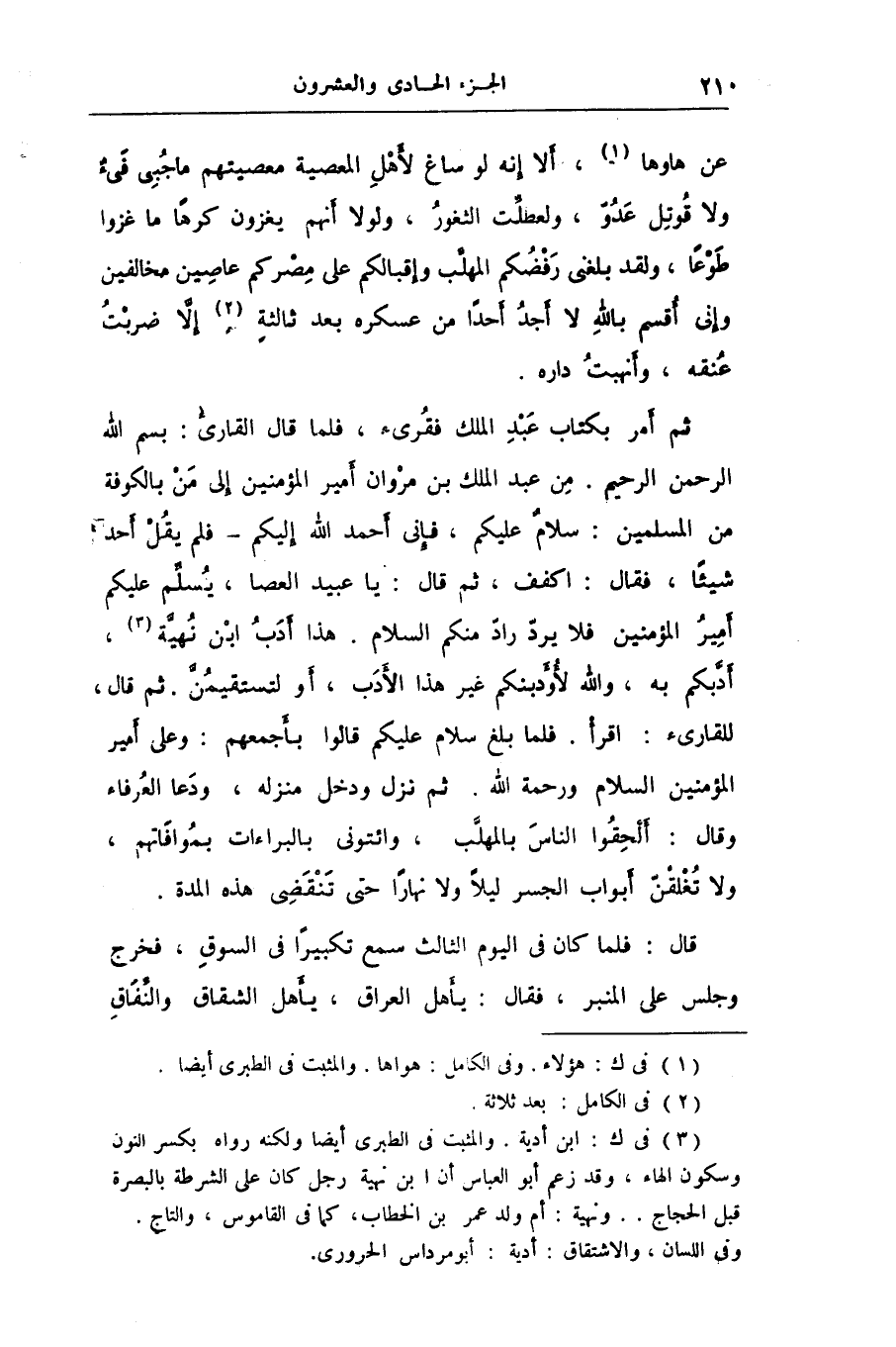 ثم أمر بكتاب عبد الملك فقرىء، فلما قال القارئ: بسم الله الرحمن الرحيم. من عبد الملك بن مروان أمير المؤمنين إلى من بالكوفة من المسلمين: سلام عليكم، فإنى أحمد الله إليكم- فلم يقل أحد شيئا، فقال: اكفف، ثم قال: يا عبيد العصا، يسلّم عليكم أمير المؤمنين فلا يردّ رادّ منكم السلام. هذا أدب ابن نهيّة «3» ، أدّبكم به، والله لأؤدبنكم غير هذا الأدب، أو لتستقيمنّ. ثم قال، للقارىء: اقرأ. فلما بلغ سلام عليكم قالوا بأجمعهم: وعلى أمير المؤمنين السلام ورحمة الله. ثم نزل ودخل منزله، ودعا العرفاء وقال: ألحقوا الناس بالمهلّب، وائتونى بالبراءات بموافاتهم، ولا تغلقنّ أبواب الجسر ليلا ولا نهارا حتى تنقضى هذه المدة.