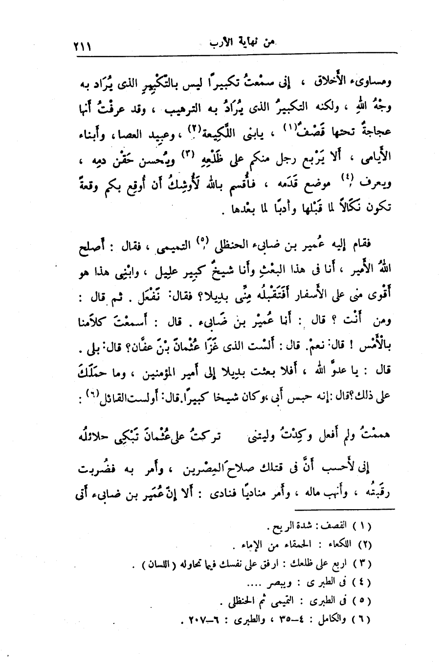 ومن أنت؟ قال: أنا عمير بن ضابىء. قال: أسمعت كلامنا بالأمس! قال: نعم. قال: ألست الذى غزا عثمان بن عفّان؟ قال: بلى.