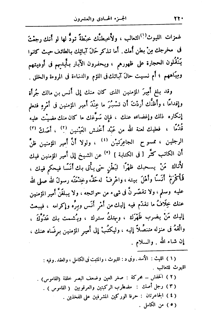 وقد بلغ أمير المؤمنين الذى كان منك إلى أنس بن مالك جرأة وإقداما، وأظنّك أردت أن تسبر ما عند أمير المؤمنين فى أمره فتعلم إنكاره ذلك وإغضاءه عنك، فإن سوّغك ما كان منك مضيت عليه قدما، فعليك لعنة الله من عبد أخفش العينين «2» ، أصكّ «3» الرجلين، ممسوح الجاعرتين «4» ، ولولا أنّ أمير المؤمنين ظنّ أن الكاتب كثّر [فى الكتابة] «5» عن الشيخ إلى أمير المؤمنين فيك لأتاك من يسحبك ظهرا لبطن حتى يأتى بك أنسا فيحكم فيك، فأكرم أنسا وأهل بيته، واعرف له حقّه وخدمته رسول الله صلّى الله عليه وسلّم، ولا تقصّرنّ فى شىء من حوائجه، ولا يبلغنّ أمير المؤمنين عنك خلاف ما تقدّم فيه إليك من أمر أنس وبرّه وإكرامه، فيبعث إليك من يضرب ظهرك، ويهتك سترك، ويشمت بك عدوّك، والقه فى منزله متنصّلا إليه، وليكتب إلى أمير المؤمنين برضاه عنك، إن شاء الله. والسلام.