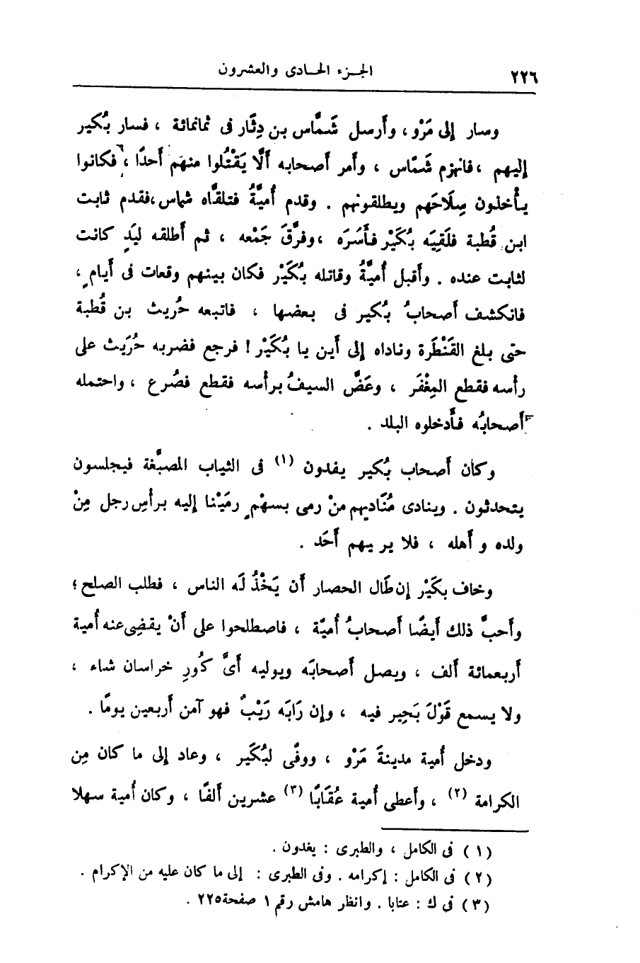 ودخل أمية مدينة مرو، ووفى لبكير، وعاد إلى ما كان من الكرامة «2» ، وأعطى أمية عقابا «3» عشرين ألفا، وكان أمية سهلا