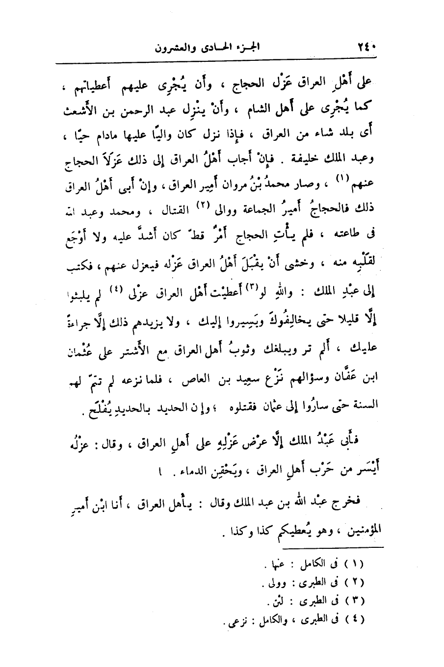 على أهل العراق عزل الحجاج، وأن يجرى عليهم أعطياتهم، كما يجرى على أهل الشام، وأن ينزل عبد الرحمن بن الأشعث أى بلد شاء من العراق، فإذا نزل كان واليا عليها مادام حيّا، وعبد الملك خليفة. فإن أجاب أهل العراق إلى ذلك عزلا الحجاج عنهم «1» ، وصار محمد بن مروان أمير العراق، وإن أبى أهل العراق ذلك فالحجاج أمير الجماعة ووالى «2» القتال، ومحمد وعبد الله فى طاعته، فلم يأت الحجاج أمر قطّ كان أشدّ عليه ولا أوجع لقلبه منه، وخشى أن يقبل أهل العراق عزله فيعزل عنهم، فكتب إلى عبد الملك: والله لو «3» أعطيت أهل العراق عزلى «4» لم يلبثوا إلّا قليلا حتى يخالفوك ويسيروا إليك، ولا يزيدهم ذلك إلّا جراءة عليك، ألم تر ويبلغك وثوب أهل العراق مع الأشتر على عثمان ابن عفّان وسؤالهم نزع سعيد بن العاص، فلما نزعه لم تتمّ لهم السنة حتى ساروا إلى عثمان فقتلوه؛ وإن الحديد بالحديد يفلح.