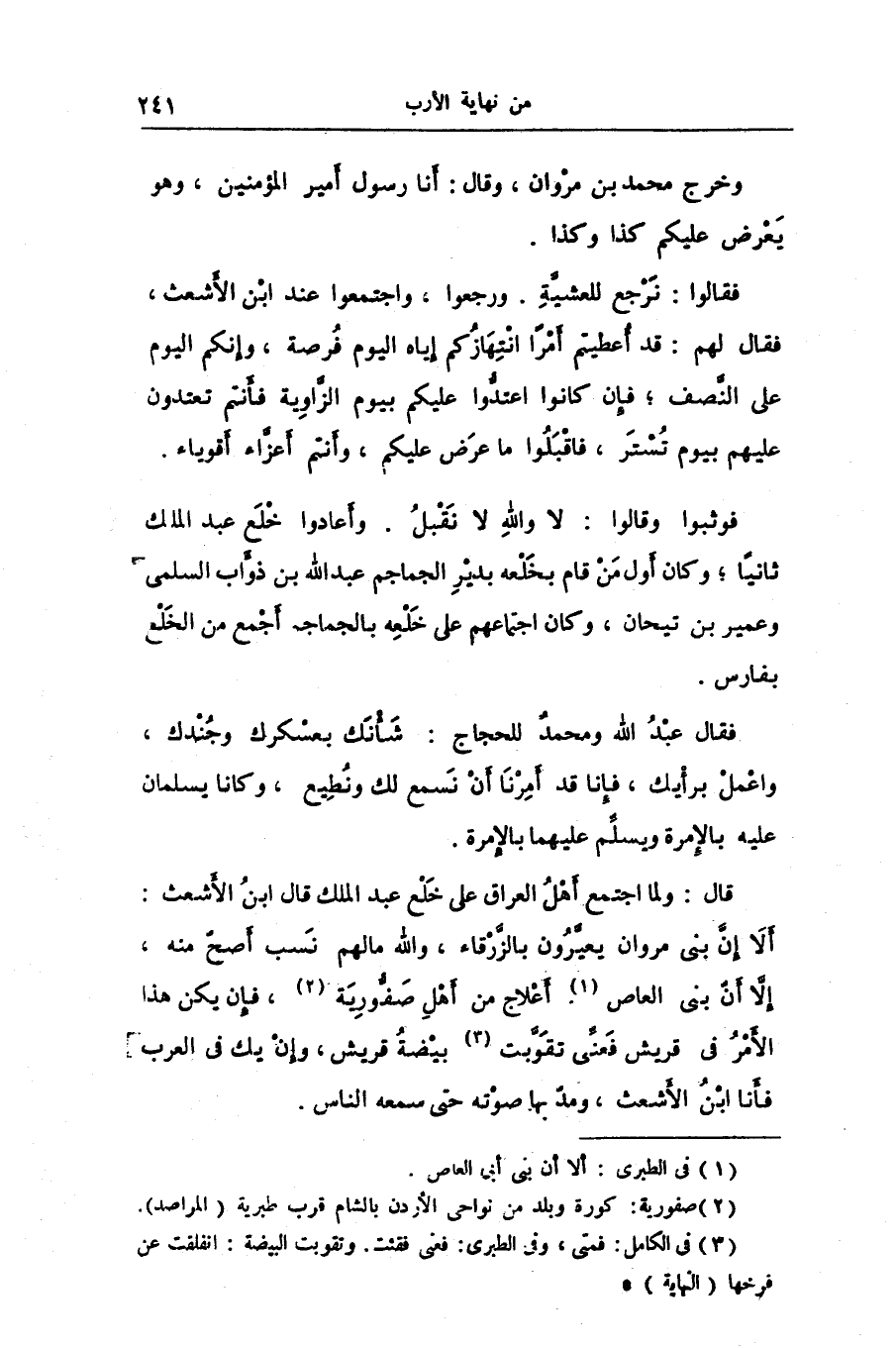 فوثبوا وقالوا: لا والله لا نقبل. وأعادوا خلع عبد الملك ثانيا؛ وكان أول من قام بخلعه بدير الجماجم عبد الله بن ذؤاب السلمى وعمير بن تيحان، وكان اجتماعهم على خلعه بالجماجم أجمع من الخلع بفارس.