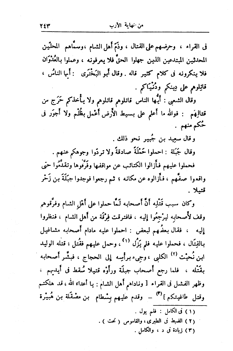 وكان سبب قتله أنّ أصحابه لمّا حملوا على أهل الشام وفرّقوهم وقف لأصحابه ليرجعوا إليه، فافترقت فرقة من أهل الشام، فنظروا إليه، فقال بعضهم لبعض: احملوا عليه مادام أصحابه مشاغيل بالقتال، فحملوا عليه فلم يزل «1» ، وحمل عليهم فقتل؛ قتله الوليد ابن نحيت «2» الكلبى، وجىء برأسه إلى الحجاج، فبشّر أصحابه بقتله، فلما رجع أصحاب جبلة ورأوه قتيلا سقط فى أيديهم، وظهر الفشل فى القراء [وناداهم أهل الشام: يا أعداء الله، قد هلكتم وقتل طاغيتكم] «3» - وقدم عليهم بسطام بن مصقلة بن هبيرة