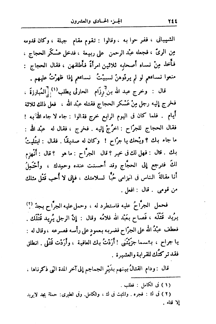 قال: وخرج عبد الله بن رزام الحارثى يطلب «1» المبارزة، فخرج إليه رجل من عسكر الحجاج فقتله عبد الله، فعل ذلك ثلاثة أيام. فلما كان فى اليوم الرابع خرج فقالوا: جاء لا جاء الله به! فقال الحجاج للجرّاح: اخرج إليه. فخرج، فقال له عبد الله: