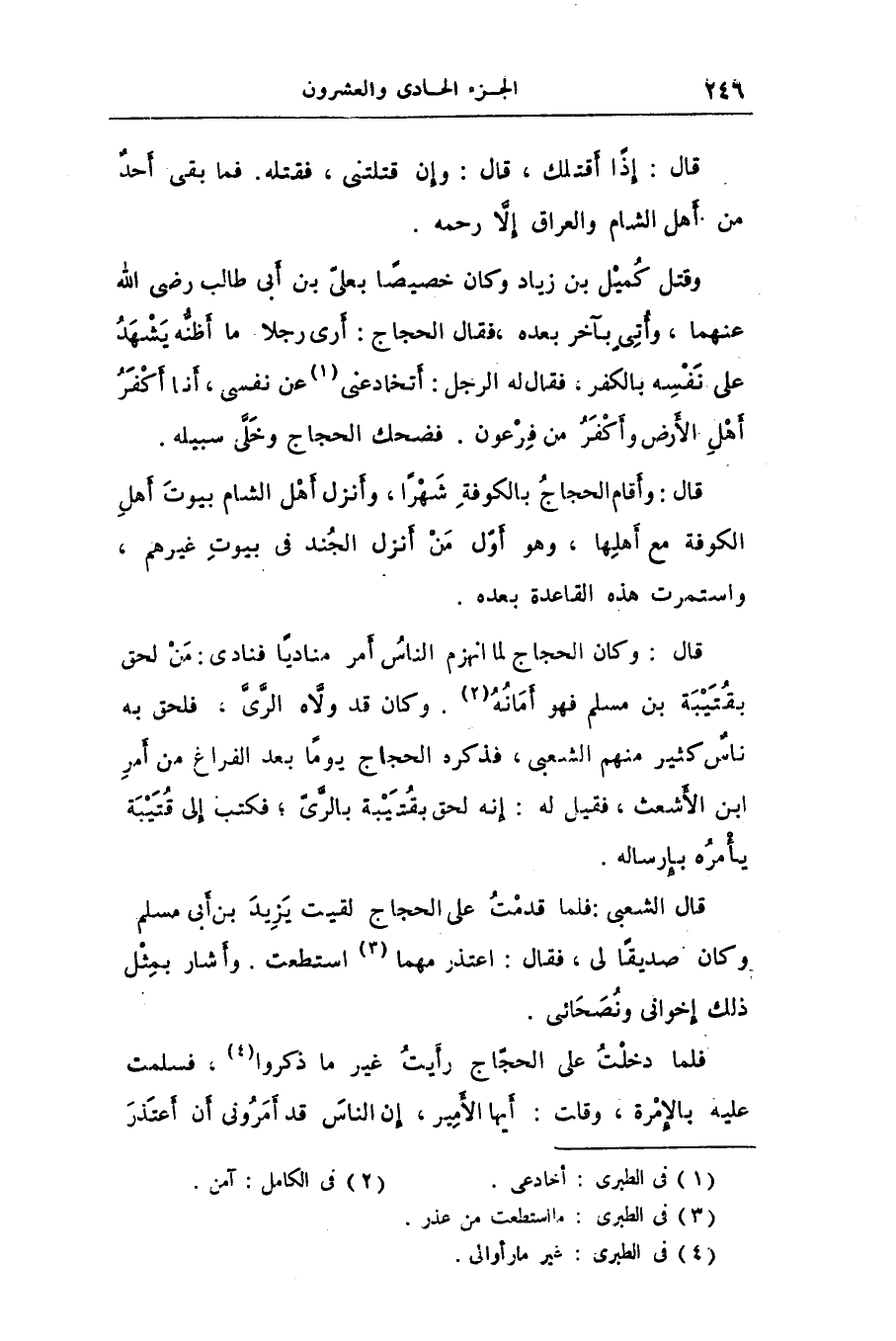 قال: وكان الحجاج لما انهزم الناس أمر مناديا فنادى: من لحق بقتيبة بن مسلم فهو أمانه «2» . وكان قد ولّاه الرّىّ، فلحق به ناس كثير منهم الشعبى، فذكره الحجاج يوما بعد الفراغ من أمر ابن الأشعث، فقيل له: إنه لحق بقتيبة بالرّىّ؛ فكتب إلى قتيبة يأمره بإرساله.