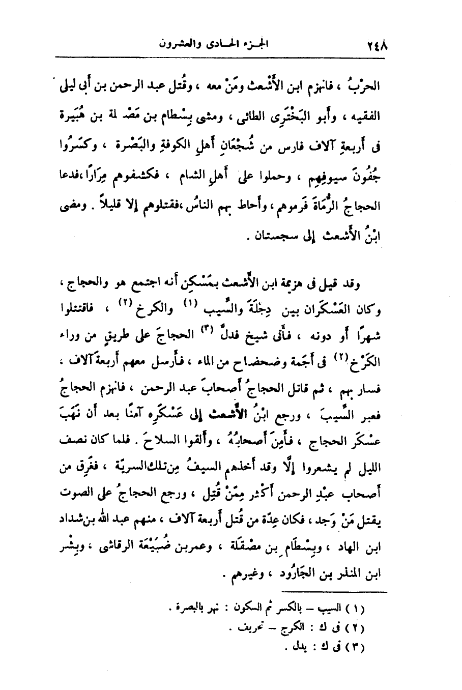 وقد قيل فى هزيمة ابن الأشعث بمسكن أنه اجتمع هو والحجاج، وكان العسكران بين دجلة والسّيب «1» والكرخ «2» ، فاقتتلوا شهرا أو دونه، فأتى شيخ فدلّ «3» الحجاج على طريق من وراء الكرخ «4» فى أجمة وضحضاح من الماء، فأرسل معهم أربعة آلاف، فسار بهم، ثم قاتل الحجاج أصحاب عبد الرحمن، فانهزم الحجاج فعبر السّيب، ورجع ابن الأشعث إلى عسكره آمنا بعد أن نهب عسكر الحجاج، فأمن أصحابه، وألقوا السلاح. فلما كان نصف الليل لم يشعروا إلّا وقد أخذهم السيف من تلك السريّة، فغرق من أصحاب عبد الرحمن أكثر ممّن قتل، ورجع الحجاج على الصوت يقتل من وجد، فكان عدّة من قتل أربعة آلاف، منهم عبد الله بن شداد ابن الهاد، وبسطام بن مصقلة، وعمر بن ضبيعة الرقاشى، وبشر ابن المنذر بن الجارود، وغيرهم.