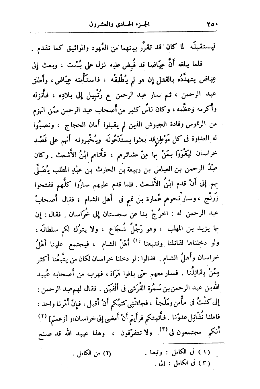 فلما بلغه أنّ عياضا قد قبض عليه نزل على بست، وبعث إلى عياض يتهدّده بالقتل إن هو لم يطلقه، فاستأمنه عياض، وأطلق عبد الرحمن، ثم سار عبد الرحمن مع رتبيل إلى بلاده، فأنزله وأكرمه وعظّمه، وكان ناس كثير من أصحاب عبد الرحمن ممّن انهزم من الرءوس وقادة الجيوش الذين لم يقبلوا أمان الحجاج، ونصبوا له العداوة فى كل موطن قد بعثوا يستدعونه ويخبرونه أنهم على قصد خراسان ليقووا بمن بها من عشائرهم، فأتاهم ابن الأشعث. وكان عبد الرحمن بن العباس بن ربيعة بن الحارث بن عبد المطلب يصلّى بهم إلى أن قدم ابن الأشعث. فلما قدم عليهم ساروا كلّهم ففتحوا زرنج، وسار نحوهم عمارة بن تميم فى أهل الشام؛ فقال أصحاب عبد الرحمن له: اخرج بنا عن سجستان إلى خراسان. فقال: إن بها يزيد بن المهلب، وهو رجل شجاع، ولا يترك لكم سلطانه، ولو دخلناها لقاتلنا وتتبعنا «1» أهل الشام، فيجتمع علينا أهل خراسان وأهل الشام. فقالوا: لو دخلنا خراسان لكان من يتّبعنا أكثر ممّن يقاتلنا. فسار معهم حتى بلغوا هراة، فهرب من أصحابه عبيد الله بن عبد الرحمن بن سمرة القرشى فى ألفين. فقال لهم عبد الرحمن: