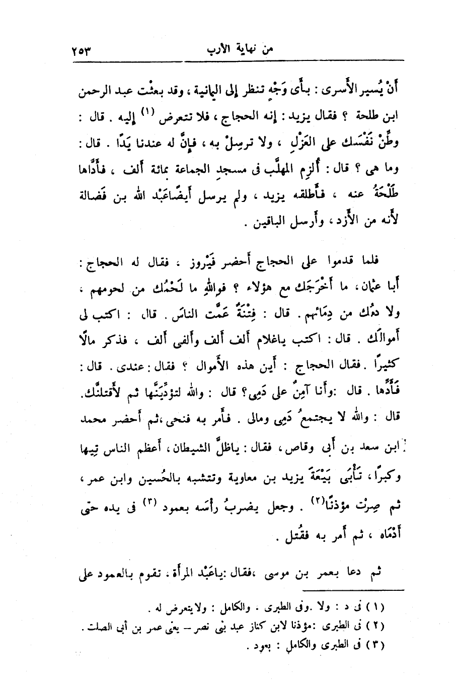 قال: والله لا يجتمع دمى ومالى. فأمر به فنحى، ثم أحضر محمد ابن سعد بن أبى وقاص، فقال: يا ظلّ الشيطان، أعظم الناس تيها وكبرا، تأبى بيعة يزيد بن معاوية وتتشبه بالحسين وابن عمر، ثم صرت مؤذنا «2» . وجعل يضرب رأسه بعمود «3» فى يده حتى أدماه، ثم أمر به فقتل.