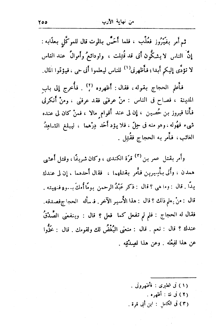 فأعلم الحجاج بقوله، فقال: أظهروه «2» ، فأخرج إلى باب المدينة، فصاح فى الناس: من عرفنى فقد عرفنى، ومن أنكرنى فأنا فيروز بن حصين، إن لى عند أقوام مالا، فمن كان لى عنده شىء فهوله، وهو منه فى حلّ، فلا يؤد أحد درهما، ليبلغ الشاهد الغائب، فأمر به الحجاج فقتل.