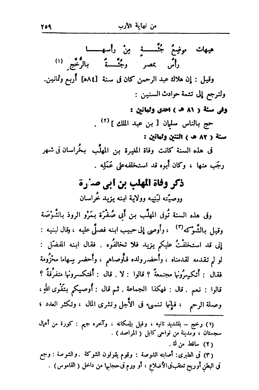 ووصيّته لبنيه وولاية ابنه يزيد خراسان وفى هذه السنة توفى المهلّب بن أبى صفرة بمرو الروذ بالشّوصة وقيل بالشّوكة «3» ، وأوصى إلى حبيب ابنه فصلّى عليه، وقال لبنيه: