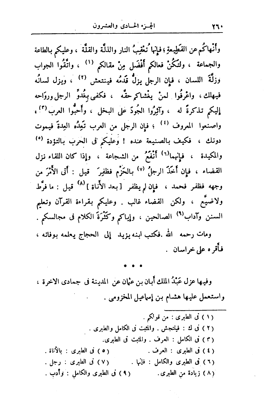 وأنهاكم عن القطيعة؛ فإنها تعقب النار والذلّة والقلّة، وعليكم بالطاعة والجماعة، ولتكن فعالكم أفضل من مقالكم «1» ، واتّقوا الجواب وزلّة اللسان، فإن الرجل يزلّ قدمه فينتعش «2» ، ويزل لسانه فيهلك، واعرفوا لمن يغشاكم حقّه، فكفى بغدوّ الرجل ورواحه إليكم تذكرة له، وآثروا الجود على البخل، وأحبّوا العرب «3» ، واصنعوا المعروف «4» ؛ فإن الرجل من العرب تعده العدة فيموت دونك، فكيف بالصنيعة عنده! وعليكم فى الحرب بالتؤدة «5» والمكيدة، فإنهما «6» أنفع من الشجاعة، وإذا كان اللقاء نزل القضاء، فإن أخذ الرجل «7» بالحزم فظفر قيل: أتى الأمر من وجهه فظفر فحمد، فإن لم يظفر [بعد الأناة] «8» قيل: ما فرّط ولا ضيّع، ولكن القضاء غالب. وعليكم بقراءة القرآن وتعليم السنن وآداب «9» الصالحين، وإياكم وكثرة الكلام فى مجالسكم.