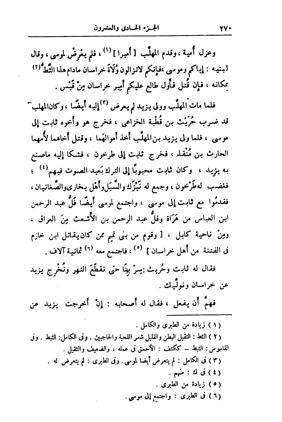 فلما مات المهلّب وولى يزيد لم يعرض «3» إليه أيضا، وكان المهلب قد ضرب حريث بن قطبة الخزاعى، فخرج هو وأخوه ثابت إلى موسى، فلما ولى يزيد بن المهلّب أخذ أموالهما، وقتل أخاهما لأمهما الحارث بن منقذ، فخرج ثابت إلى طرخون، فشكا إليه ما صنع به يزيد، وكان ثابت محبوبا إلى الترك بعيد الصوت فيهم «4» ؛ فغضب له طرخون، وجمع له نيزك والسّبل وأهل بخارى والصّغانيان، فقدموا مع ثابت إلى موسى، واجتمع لموسى أيضا فلّ عبد الرحمن ابن العباس من هراة وفلّ عبد الرحمن بن الأشعث من العراق، ومن ناحية كابل، [وقوم من بنى تميم ممن كان يقاتل ابن خازم فى الفتنة من أهل خراسان] «5» ، فاجتمع معه «6» ثمانية آلاف.