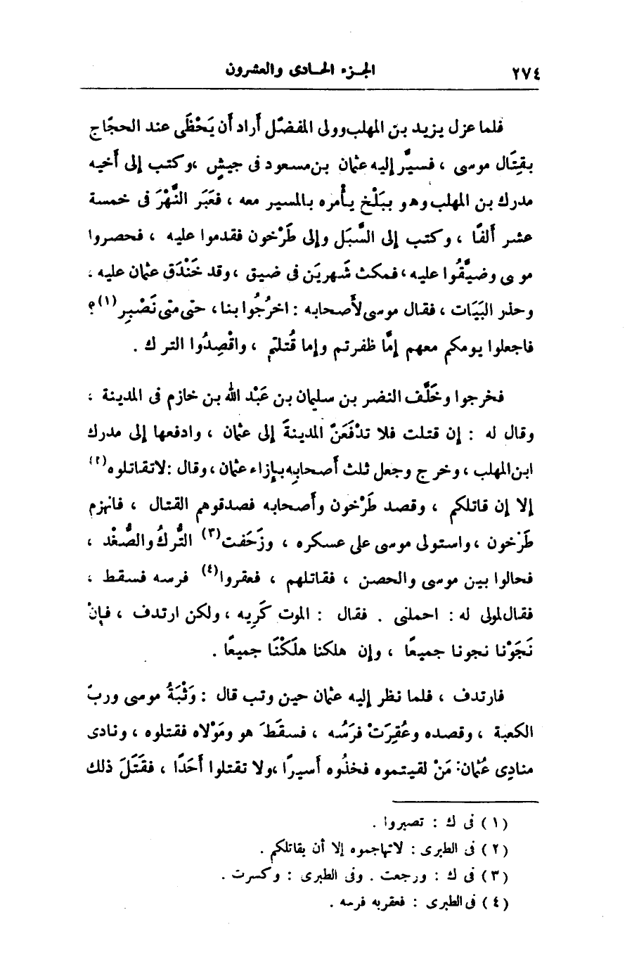 فخرجوا وخلّف النضر بن سليمان بن عبد الله بن خازم فى المدينة، وقال له: إن قتلت فلا تدفعنّ المدينة إلى عثمان، وادفعها إلى مدرك ابن المهلب، وخرج وجعل ثلث أصحابه بإزاء عثمان، وقال: لا تقاتلوه «2» إلا إن قاتلكم، وقصد طرخون وأصحابه فصدقوهم القتال، فانهزم طرخون، واستولى موسى على عسكره، وزحفت «3» التّرك والصّغد، فحالوا بين موسى والحصن، فقاتلهم، فعقروا «4» فرسه فسقط، فقال لمولى له: احملنى. فقال: الموت كريه، ولكن ارتدف، فإن نجونا نجونا جميعا، وإن هلكنا هلكنا جميعا.