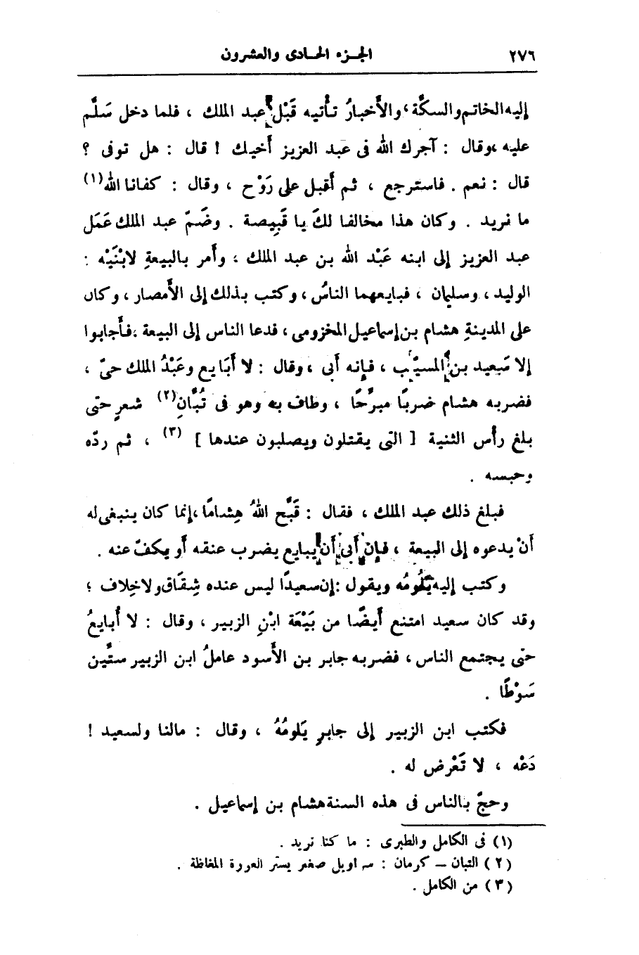 فبلغ ذلك عبد الملك، فقال: قبّح الله هشاما، إنما كان ينبغى له أن يدعوه إلى البيعة، فإن أبى أن يبايع يضرب عنقه أو يكفّ عنه.