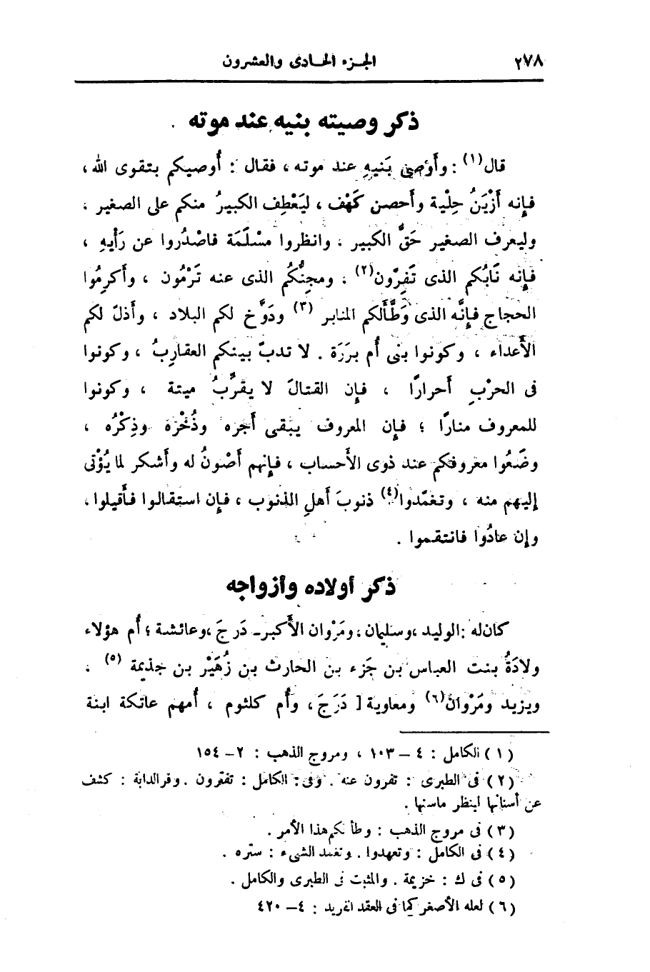 قال «1» : وأوصى بنيه عند موته، فقال: أوصيكم بتقوى الله، فإنه أزين حلية وأحصن كهف، ليعطف الكبير منكم على الصغير، وليعرف الصغير حقّ الكبير، وانظروا مسلمة فاصدروا عن رأيه، فإنه نابكم الذى تفرّون «2» ، ومجنّكم الذى عنه ترمون، وأكرموا الحجاج فإنّه الذى وطّألكم المنابر «3» ودوّخ لكم البلاد، وأذلّ لكم الأعداء، وكونوا بنى أم بررة. لا تدبّ بينكم العقارب، وكونوا فى الحرب أحرارا، فإن القتال لا يقرّب ميتة، وكونوا للمعروف منارا؛ فإن المعروف يبقى أجره وذخره وذكره، وضعوا معروفكم عند ذوى الأحساب، فإنهم أصون له وأشكر لما يؤتى إليهم منه، وتغمّدوا «4» ذنوب أهل الذنوب، فإن استقالوا فأقيلوا، وإن عادوا فانتقموا.