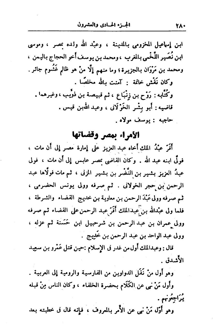 ابن إسماعيل المخزومى بالمدينة، وعبد الله ولده بمصر، وموسى ابن نصير اللّخمى بالمغرب، ومحمد بن يوسف أخو الحجاج باليمن، ومحمد بن مروان بالجزيرة؛ وما منهم إلّا من هو ظالم غشوم جائر.
