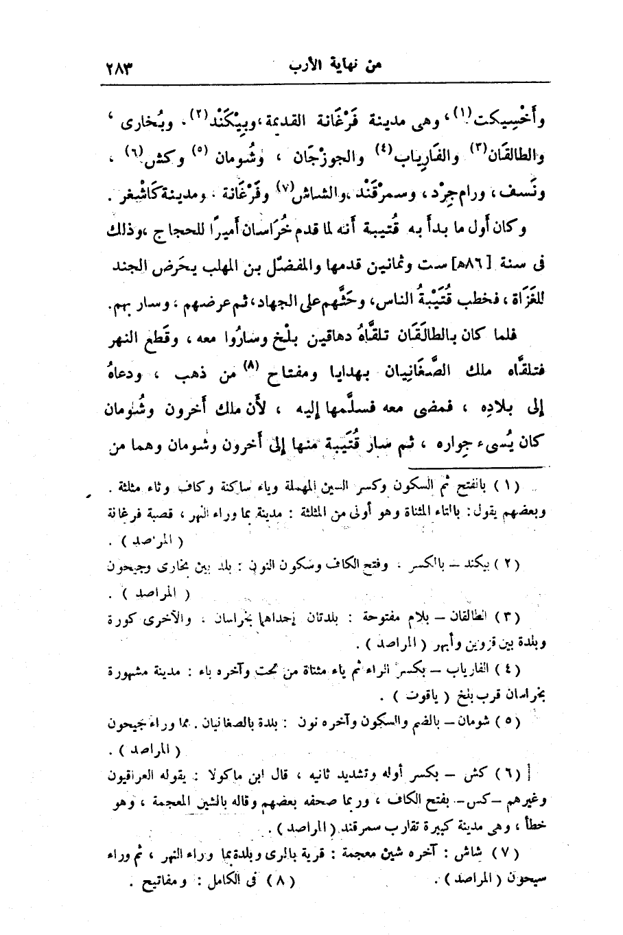 وأخسيكت «1» ، وهى مدينة فرغانة القديمة، وبيكند «2» ، وبخارى، والطالقان «3» والفارياب «4» والجوزجان، وشومان «5» وكش «6» ، ونسف، ورام جرد، وسمرقند، والشاش «7» وفرغانة، ومدينة كاشغر.