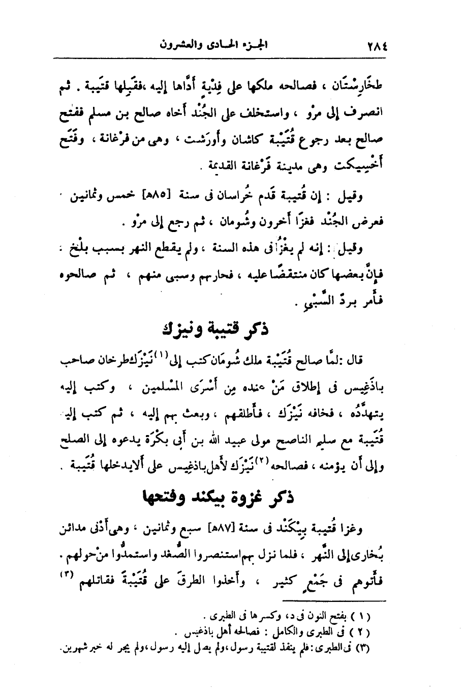 طخارستان، فصالحه ملكها على فدية أدّاها إليه، فقبلها قتيبة. ثم انصرف إلى مرو، واستخلف على الجند أخاه صالح بن مسلم ففتح صالح بعد رجوع قتيبة كاشان وأورشت، وهى من فرغانة، وفتح أخسيكت وهى مدينة فرغانة القديمة.