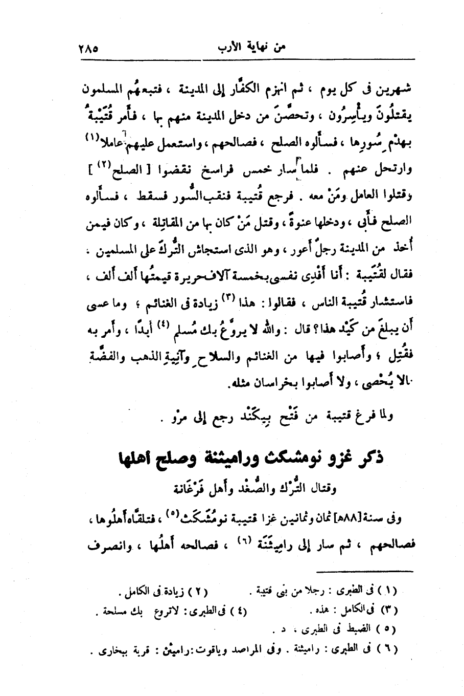 وقتال التّرك والصّغد وأهل فرغانة وفى سنة [88 هـ] ثمان وثمانين غزا قتيبة نومشكث «5» ، فتلقّاه أهلوها، فصالحهم، ثم سار إلى راميثنة «6» ، فصالحه أهلها، وانصرف