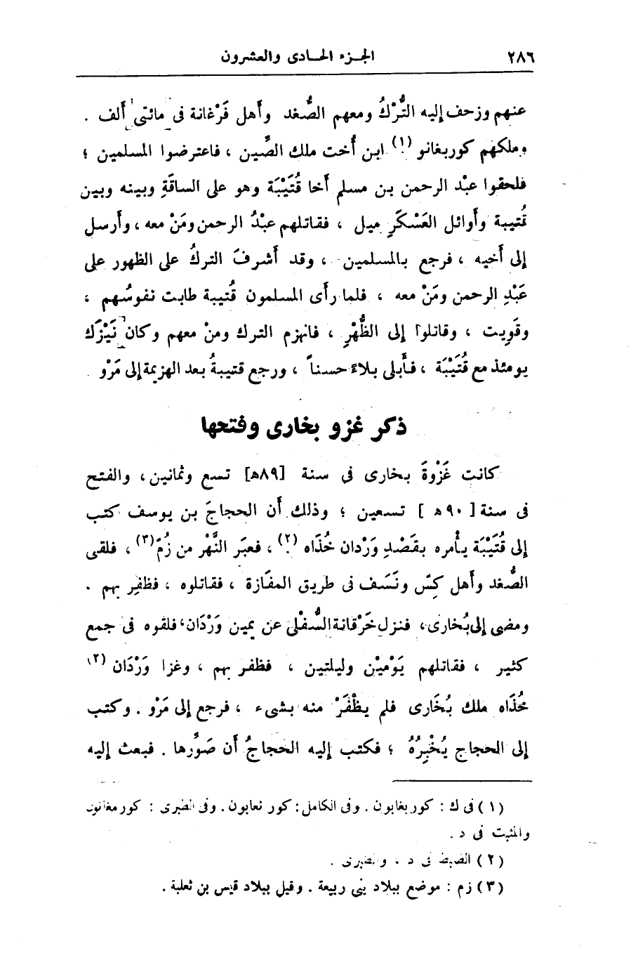 كانت غزوة بخارى فى سنة [89 هـ] تسع وثمانين، والفتح فى سنة [90 هـ] تسعين؛ وذلك أن الحجاج بن يوسف كتب إلى قتيبة يأمره بقصد وردان خذاه «2» ، فعبر النّهر من زمّ «3» ، فلقى الصّغد وأهل كسّ ونسف فى طريق المفازة، فقاتلوه، فظفر بهم.