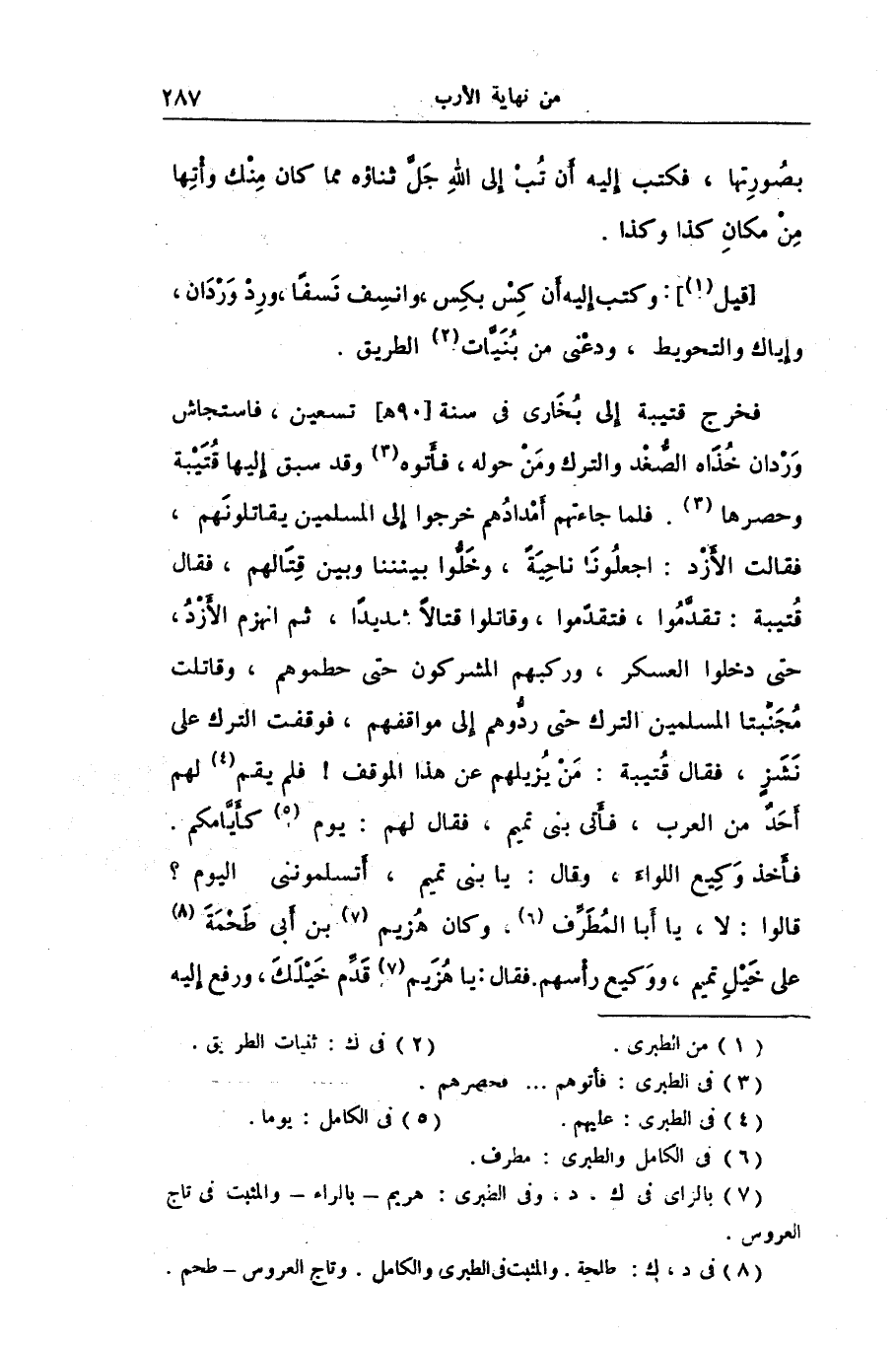 فخرج قتيبة إلى بخارى فى سنة [90 هـ] تسعين، فاستجاش وردان خذاه الصّغد والترك ومن حوله، فأتوه «3» وقد سبق إليها قتيبة وحصرها «4» . فلما جاءتهم أمدادهم خرجوا إلى المسلمين يقاتلونهم، فقالت الأزد: اجعلونا ناحية، وخلّوا بيننا وبين قتالهم، فقال قتيبة: تقدّموا، فتقدّموا، وقاتلوا قتالا شديدا، ثم انهزم الأزد، حتى دخلوا العسكر، وركبهم المشركون حتى حطموهم، وقاتلت مجنبتا المسلمين الترك حتى ردّوهم إلى مواقفهم، فوقفت الترك على نشز، فقال قتيبة: من يزيلهم عن هذا الموقف! فلم يقم «5» لهم أحد من العرب، فأتى بنى تميم، فقال لهم: يوم «6» كأيّامكم.